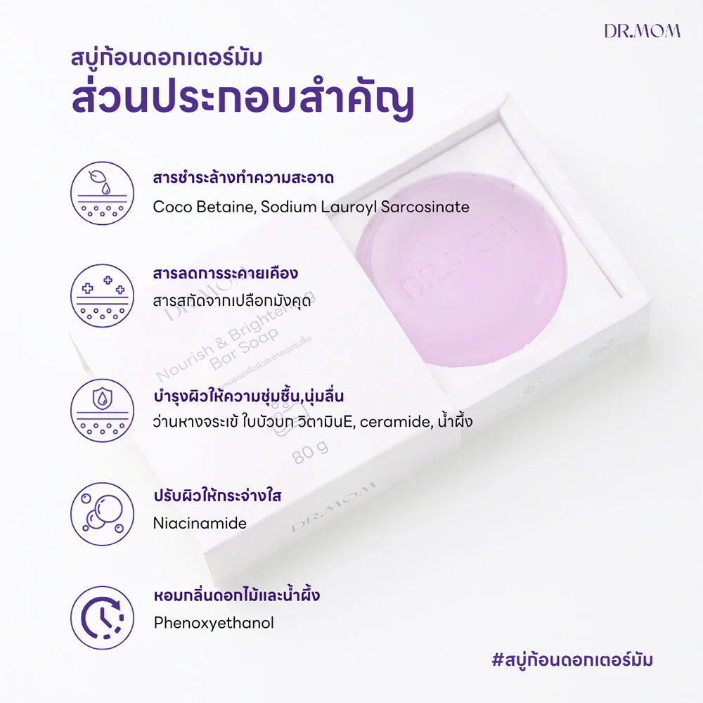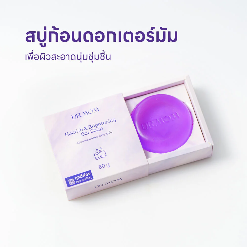 DR.MOM Nourish & Brightening Bar Soap 80g The bath soap helps cleanse the skin. It is rich in mangosteen, honey, aloe vera and gotu kola. It helps nourish the skin to be soft and moist with a fresh natural scent. It reveals smooth skin that looks bright and gives a relaxing feeling every time you use it.