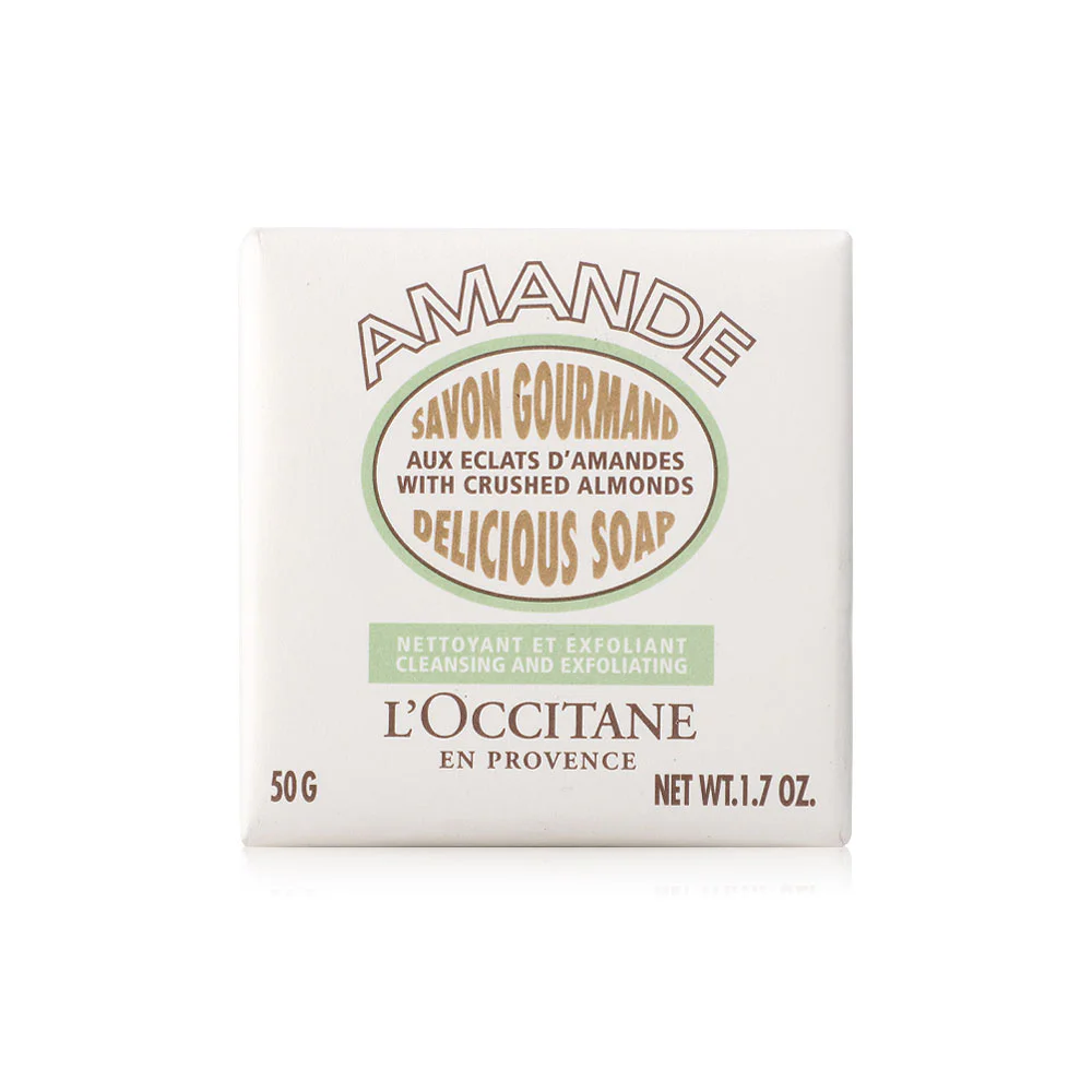 LOccitane Almond Delicious Soap 50g A special sized bar of soap specially designed to care for your soft hands. Formulated with fine almond shells, you can use this bar of soap to cleanse and remove dead skin cells on your hands or body areas such as elbows, knees and soles. Packed with the goodness of almonds and accompanied by a light and alluring fragrance.