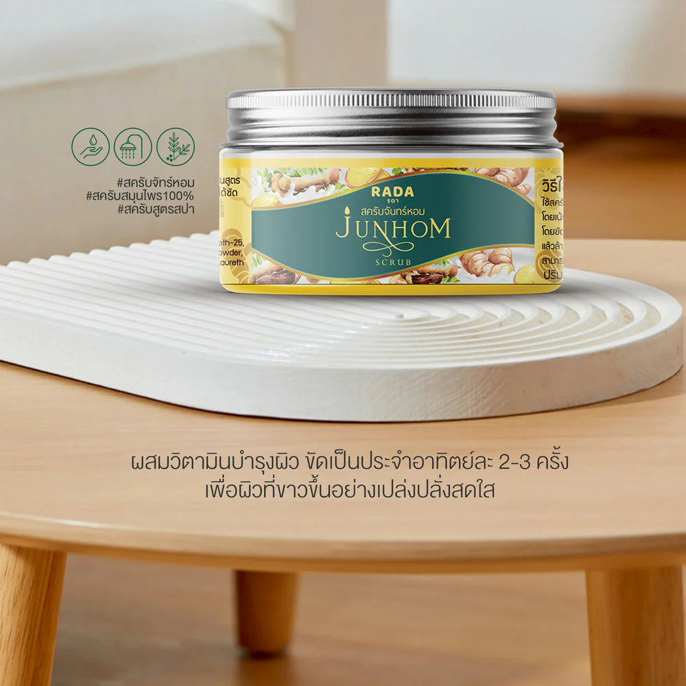 RADA BY WERADA Junhom Body Scrub 300g Herbal scrub, fragrant moon The texture is smooth and fine Combined with herbal ingredients from turmeric and Thanaka, it helps remove old skin cells and reduce dark spots, making the skin look brighter. With milk extract, Vitamin B3 and Jojoba Oil, it helps nourish the skin to be smooth, moist, and touchable, revealing bright and radiant skin.