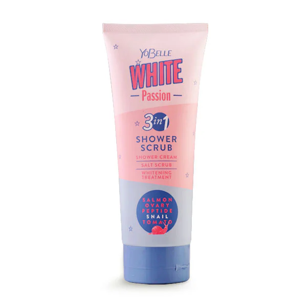 Yobelle White Passion Shower Scrub 200g 3 in 1 formula bath scrub including shower cream salt scrub and skin care treatments in one Enriched with natural extracts to help exfoliate and cleanse dirt. and nourish the skin to be clear smooth to the touch