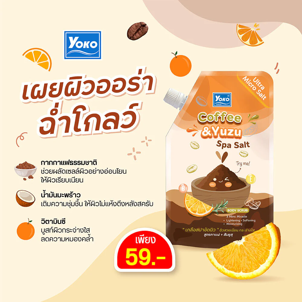 Yoko Gold Coffee & Yuzu Spa Salt 350g Wake up your skin and reveal a fresh, glowing complexion with this spa salt scrub, featuring coffee and yuzu. Formulated with real coffee grounds and natural salt, it combines the goodness of coconut oil, vitamin C, and yuzu extract to gently exfoliate and reveal smooth, clear skin with a relaxing fragrance.