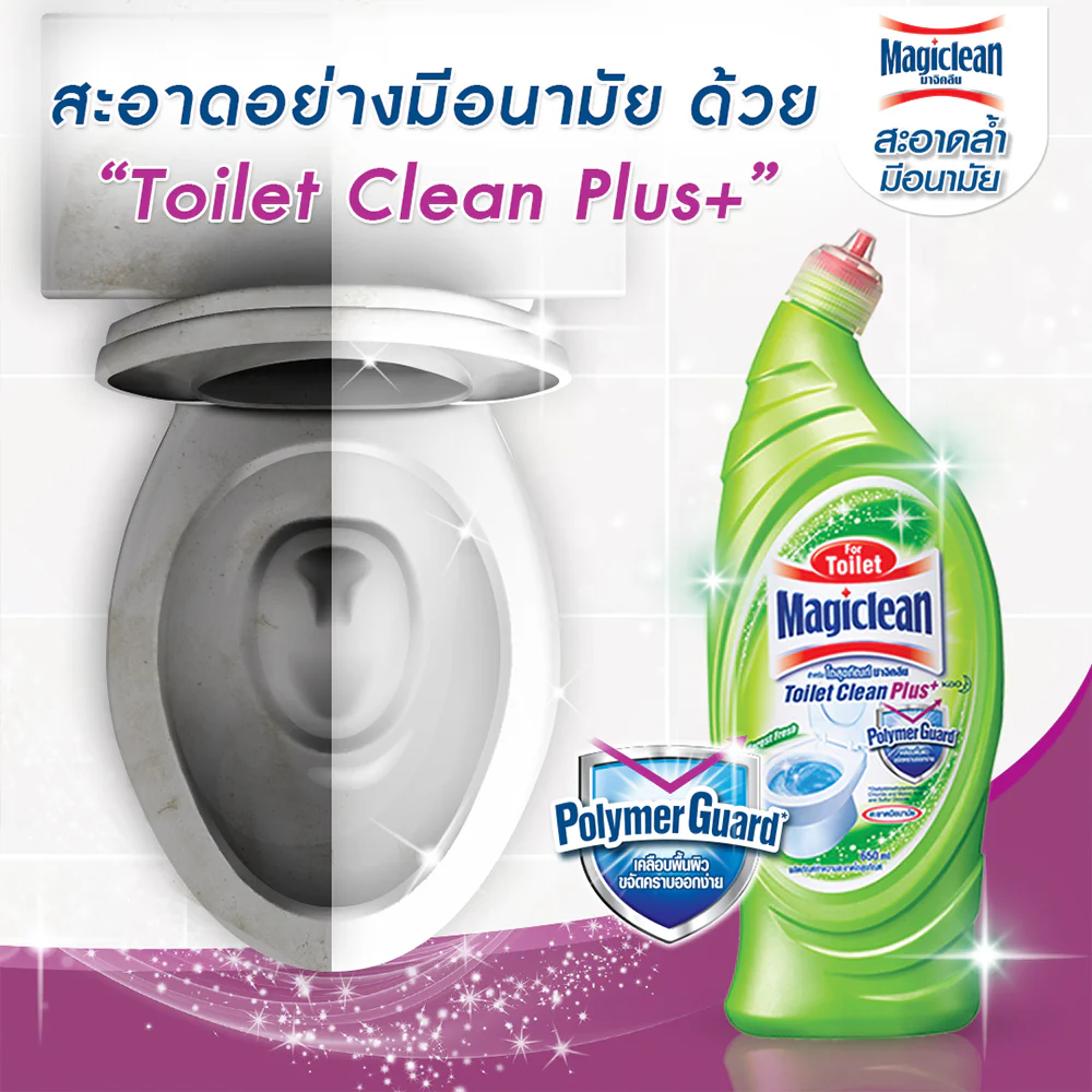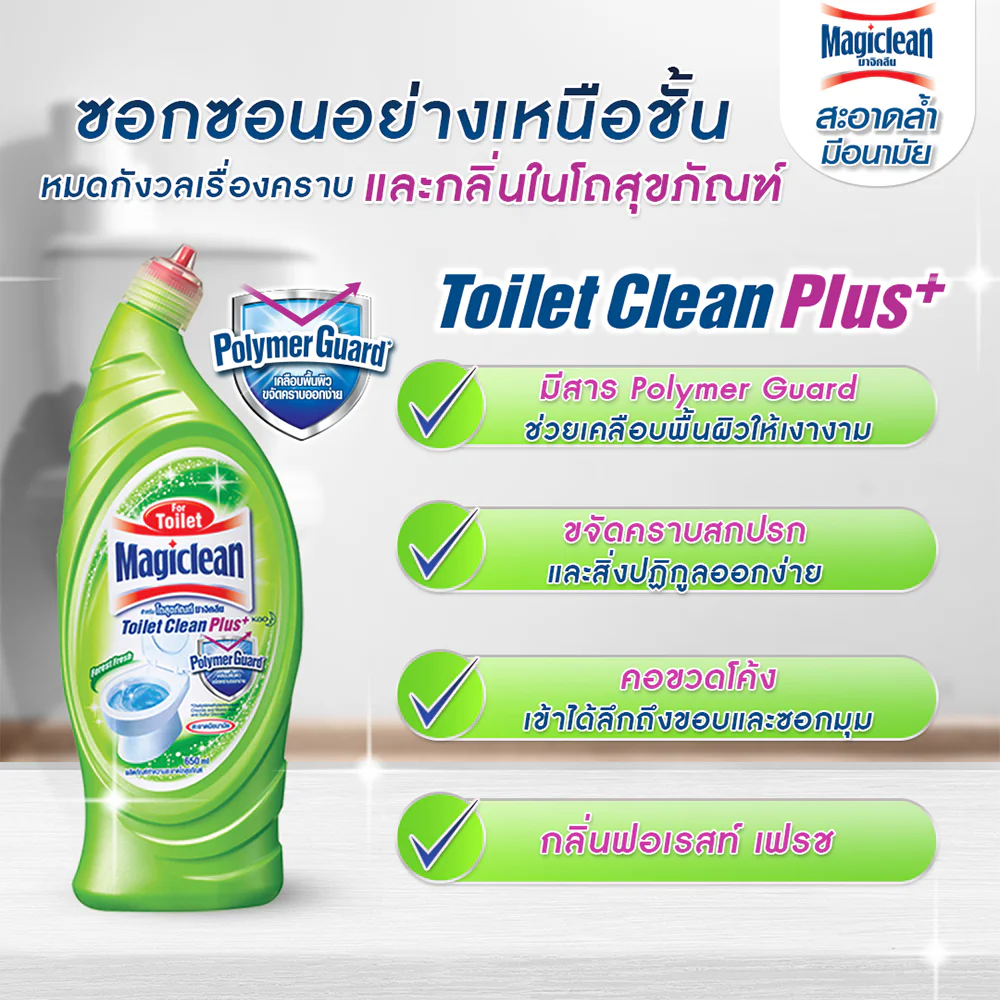 Magiclean Toilet Clean Plus 650ml Toilet bowl cleaner, Forest Fresh scent with Polymer Guard, coats the surface to shine. The curved neck of the bottle can penetrate deep into the edges and corners. It smells good every time you clean it. Can remove dirt and impurities easily without damaging the skin.