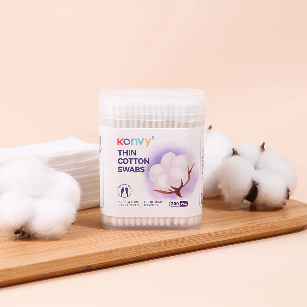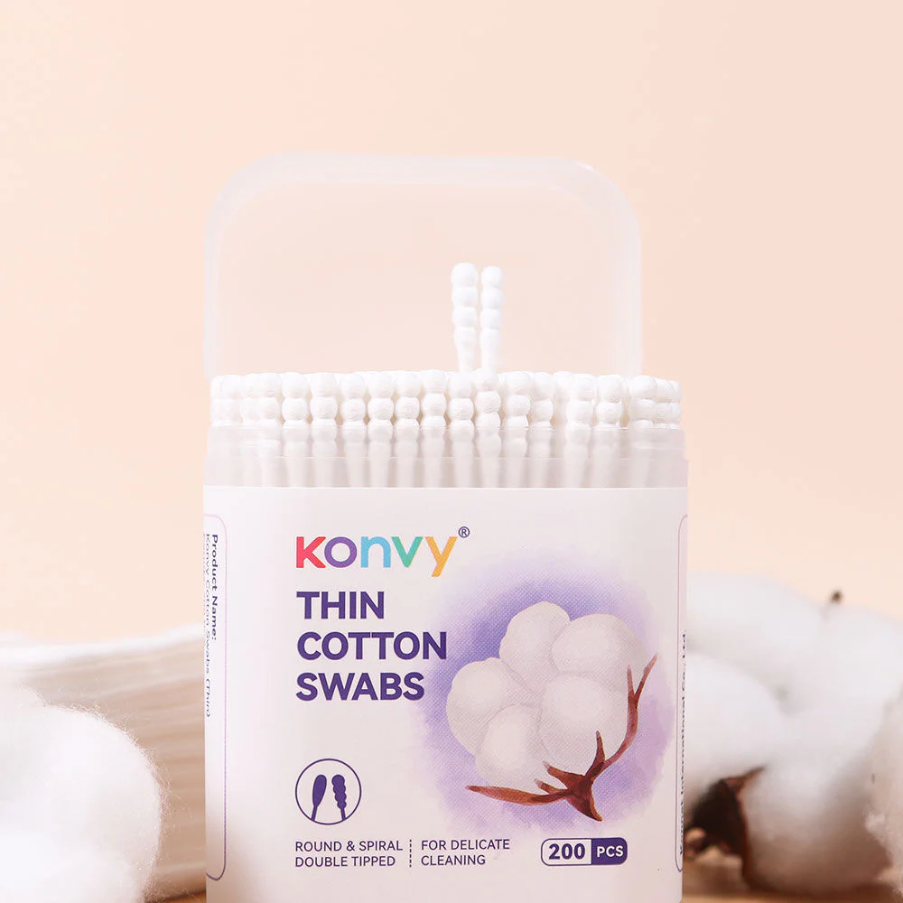 Konvy Cotton Swabs Thin 200pcs Cotton swabs with 2 heads, 200 pieces, designed with a round head and a spiral head on the same stem. Made from premium quality natural cotton, gentle on the skin. For use in cleaning ears and collecting makeup details