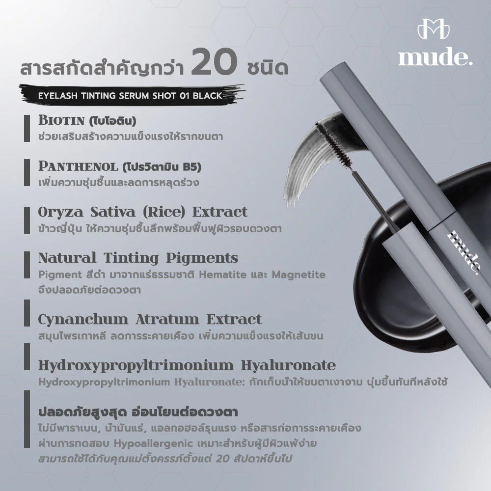 mude. Eyelash Tinting Serum Shot 3g #01 Black Get both nourishment and makeup in one step with the eyelash nourishing serum, tinted black formula, combining 2-in-1 nourishment that deeply nourishes and gives a natural black color in one step. Suitable for daytime use to enhance eyelashes to look thick, long, and healthy without having to rely on mascara. The light gel texture is quickly absorbed into the eyelashes when applied.