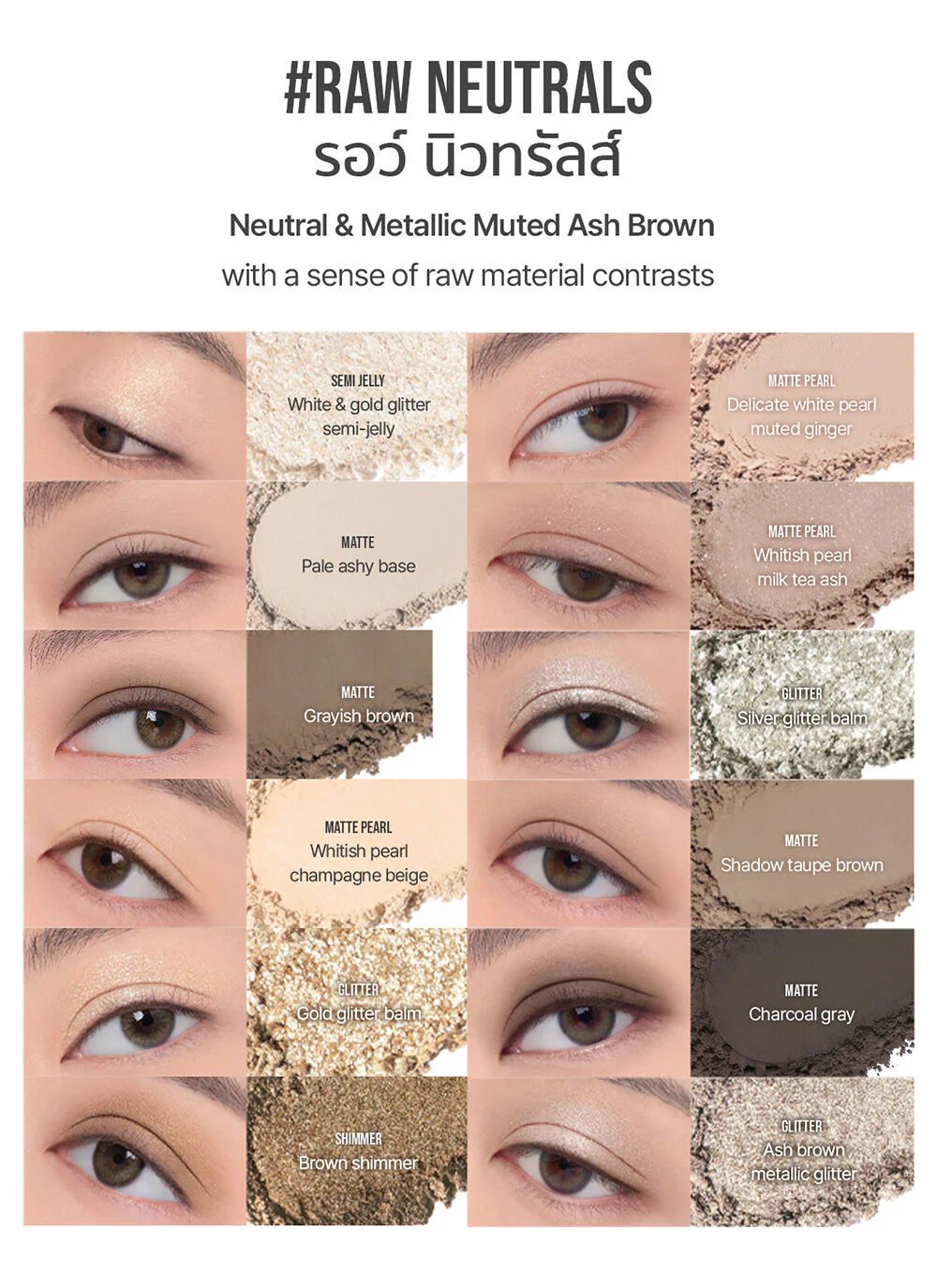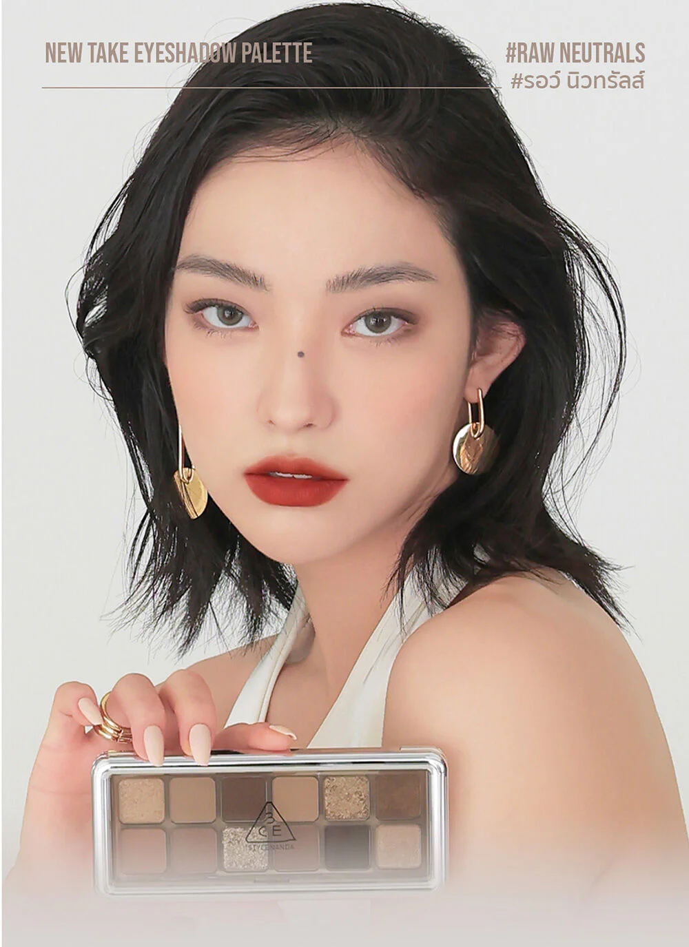 3CE New Take Eyeshadow Palette 9.5g #Raw Neutrals New Take 12-shade eyeshadow palette has matte, shimmer and glitter textures. Soft and smooth touch, dense pigments, easy to blend, no crease, long-lasting, helps create a variety of looks, giving beautiful eyes, looking dimensional, sparkling