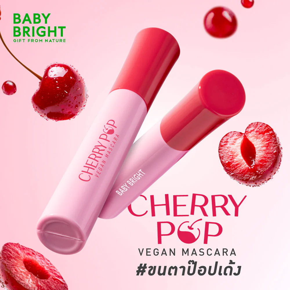 Baby Bright Cherry Pop Vegan Mascara 10g #PopularEyelashes Create stunningly long, thick lashes with this waterproof and sweatproof oil-based mascara. Formulated with fibers, it lengthens lashes and makes eyes look large and charming in every situation. It comes with a 2-layer silicone brush head that helps brush lashes beautifully, reaching every angle, lash by lash. Easy to brush without clumping. The short bristles help thicken lashes, while the long bristles help curl, spread, and separate lashes. Nourished with cherry seed oil extract, which is rich in antioxidants and natural vitamin C, it also contains pure argan oil extract, which has antioxidants and vitamin E, helping to increase moisture and strengthen lashes, reducing eyelash loss. Chamomile extract soothes the skin around the eyes, creating a sweet, luscious look with long, thick, curled, and beautifully separated lashes all day long.