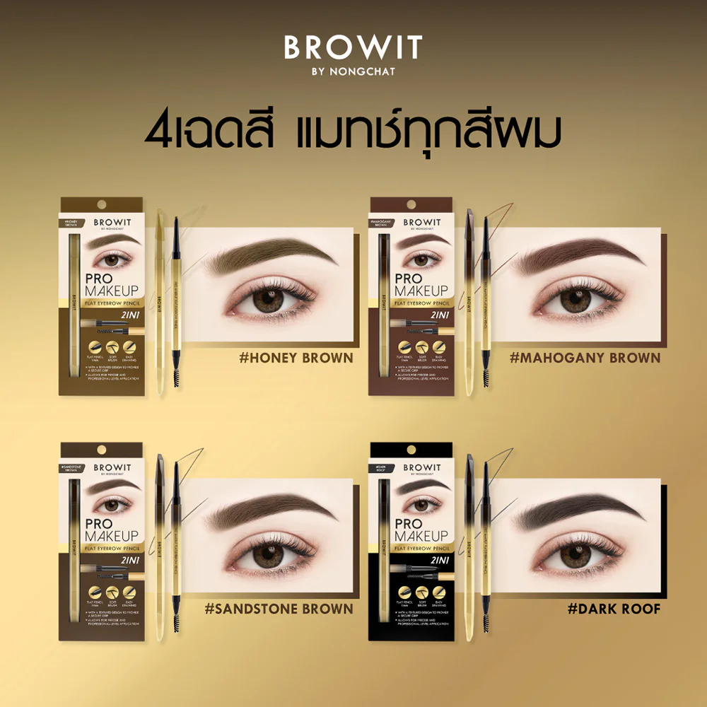 Browit Pro Makeup Flat Eyebrow Pencil 0.08g #Sandstone BrownAutomatic rotating eyebrow pencil with square design, easy to grip. Comes with a flat pencil tip to create eyebrow lines, line by line, giving a beautiful shape like a makeup artist drew it. The pencil is long-lasting, waterproof, sweatproof, color does not drop, does not smudge during the day. Comes with a high-quality eyebrow brush head, very small, slender and soft, adding softness and looking more natural.