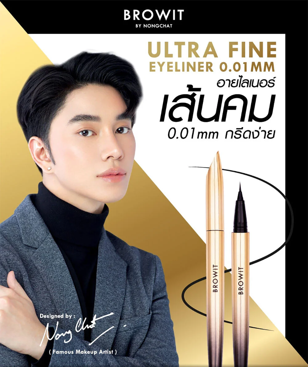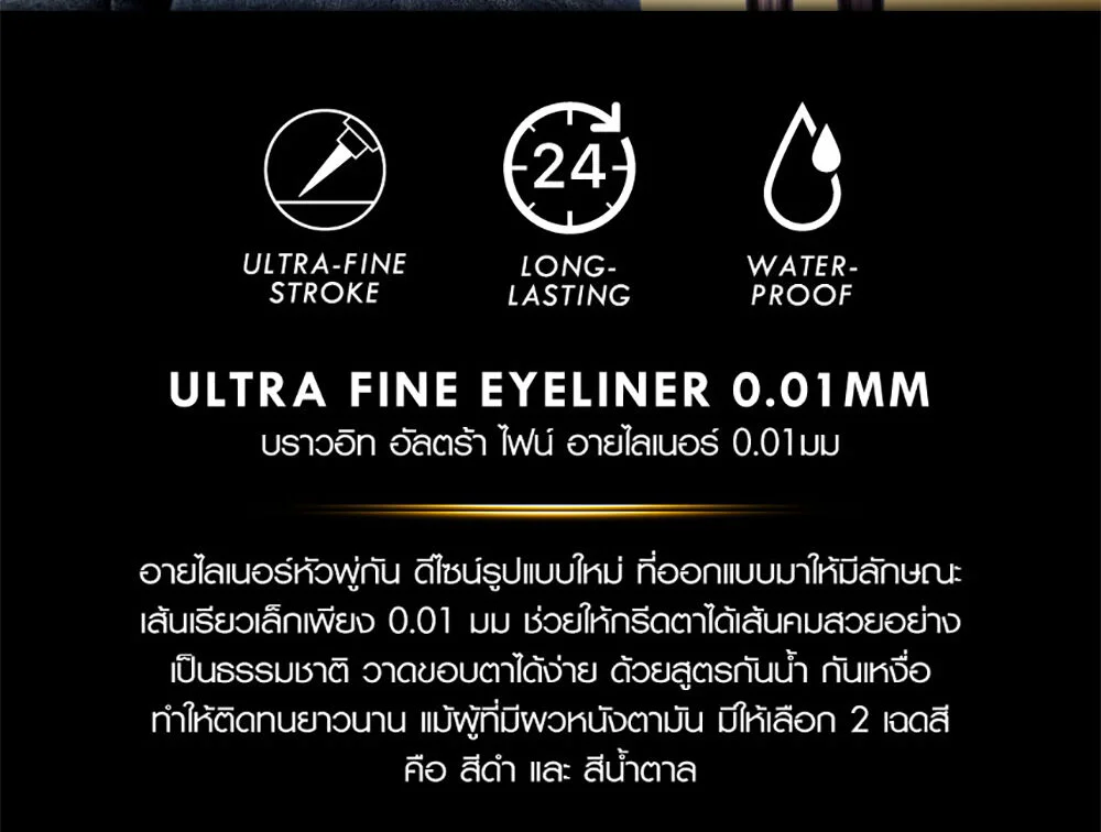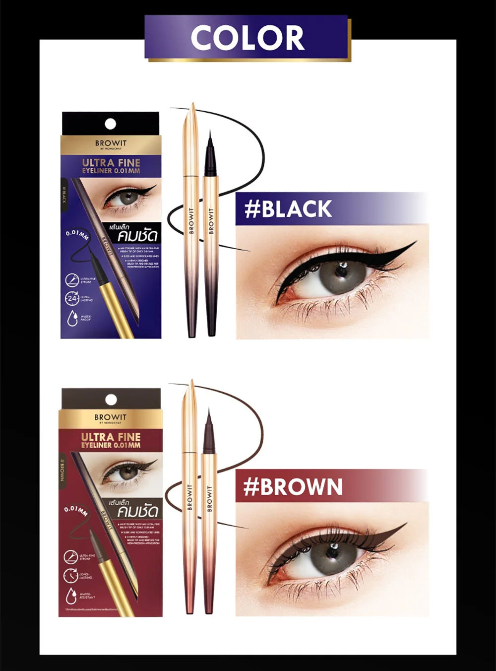 Browit Ultra Fine Eyeliner 0.01mm 0.5g #Brown This brush-tip eyeliner is designed with an ultra-fine 0.01mm tip, allowing for naturally beautiful eyeliner application. The new brush design features bristles that make drawing the eyeliner easy. It's long-lasting, even for those with oily eyelids, thanks to its waterproof and sweatproof formula. Available in two shades: black and brown.