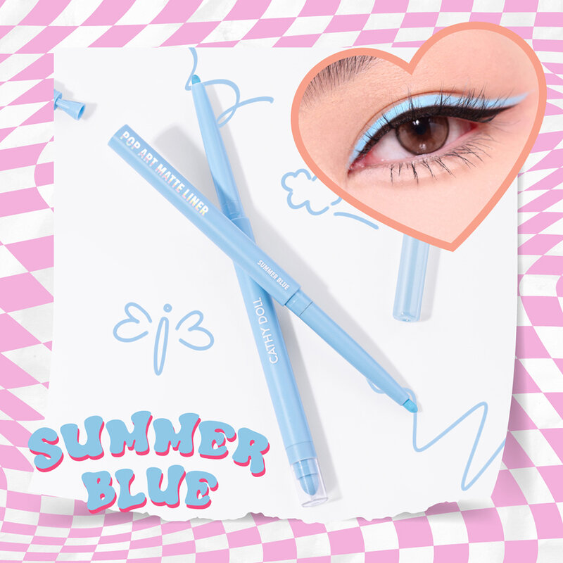 Cathy Doll Pop Art Matte Liner 0.25g #Summer Blue Colorful eyeliner, matte texture, soft and smooth to the touch, easy to draw, beautiful, clear colors, waterproof, sweatproof, long-lasting, comes with a silicone head for blending colors or removing excess to capture details. Can be used as both an eyeliner and eyeshadow to create a variety of looks on the face, giving beautiful, bright, unique eyes.