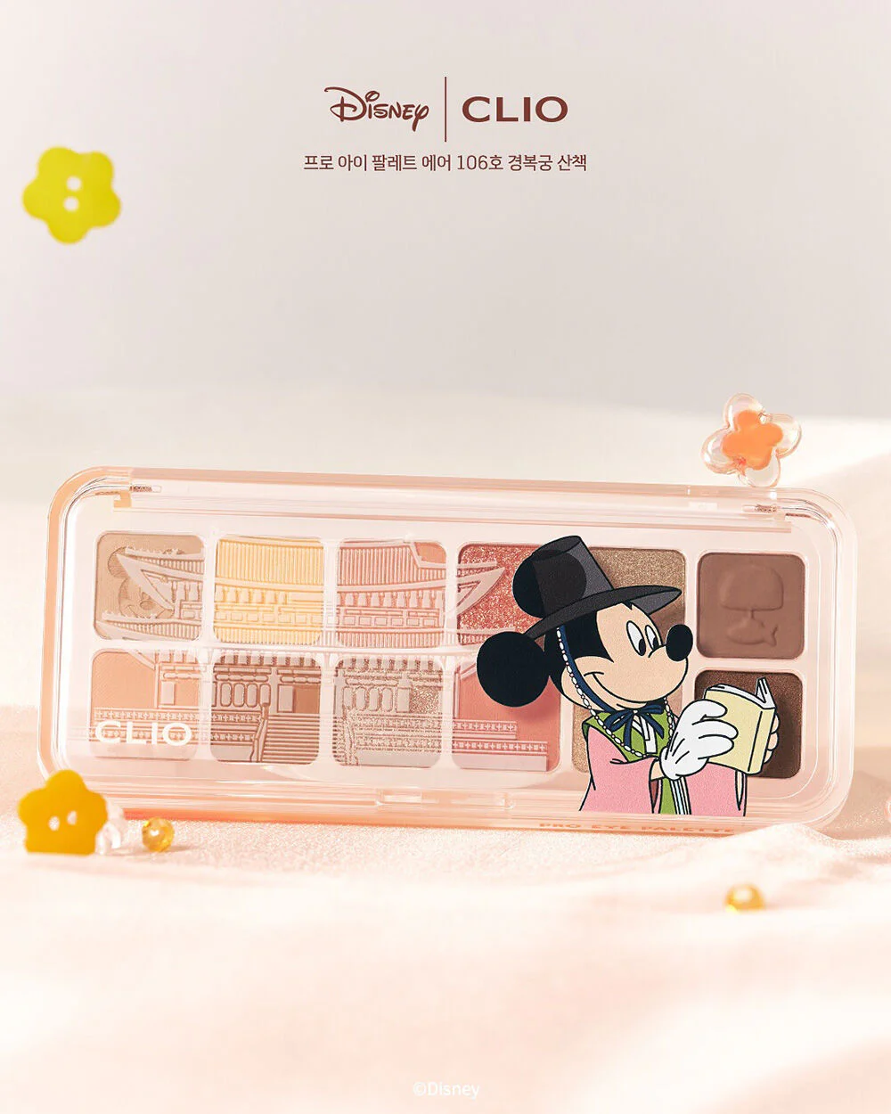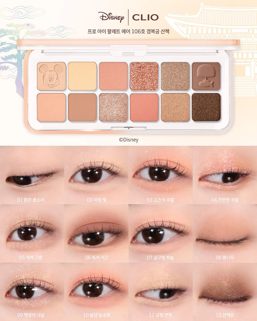 CLIO Pro Eye Palette Air 7.2g #106 Gyeongbokgung Stroll 12-shade eyeshadow palette with dense, long-lasting pigments, including matte, shimmer, and glitter. The texture is extra-fine (Ultra-Fine Powder), giving a light touch that isn't heavy on the eyes. The color tones cover everything from pink-peach to gold-brown. Comes with a limited-edition collection with a Disney Edition pattern, the charm of Korean spring, allowing you to create a soft, beautiful look every day.