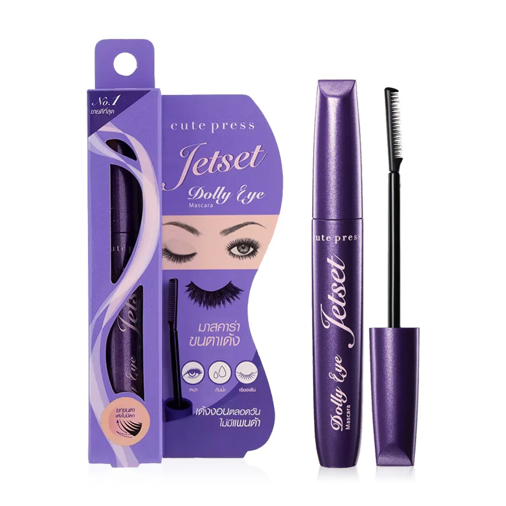 Cute Press Jet Set Dolly Eye Mascara 7g เCreate big, charming eyes with a beautiful curled eyelash mascara. Comes with a Dolly comb brush that fills the eyelashes to be beautifully arranged from the base to the tip. Stand out, long, thick and curled immediately after brushing. No need to worry about smudging with a waterproof formula.