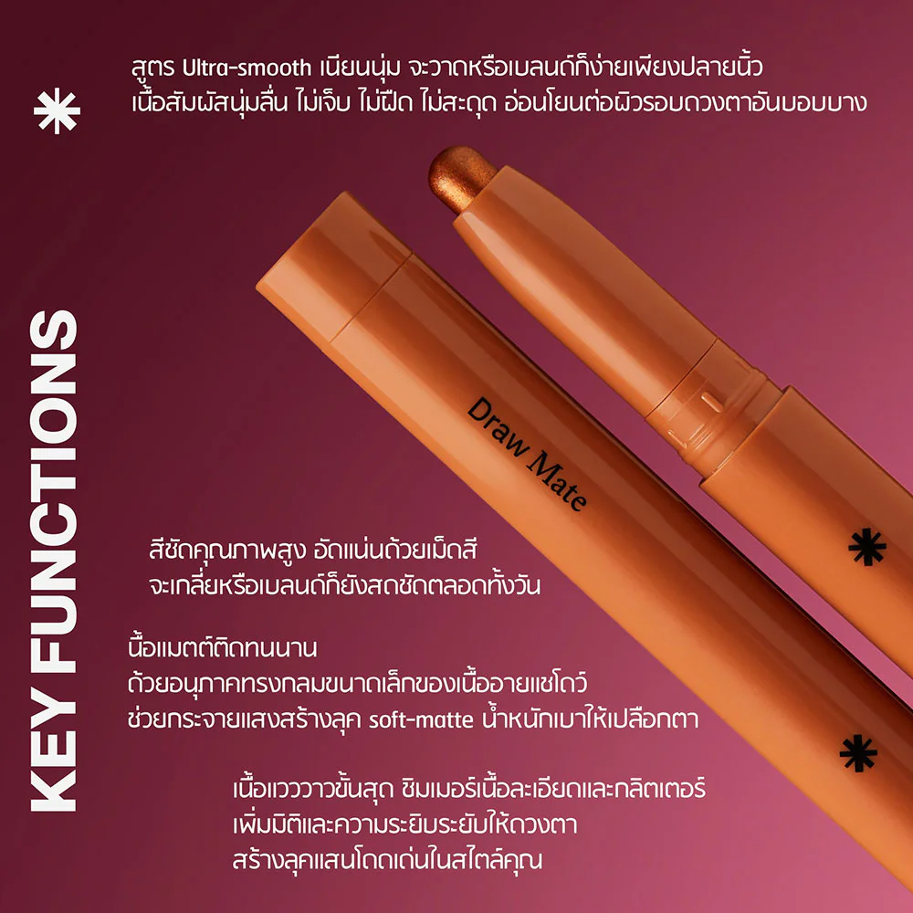 EVERPINK Draw Mate 1.2g #04 Blaze Eyeshadow stick, soft and smooth cream texture, clear and long-lasting color, waterproof and sweatproof for a long time, easy to spread, light and comfortable on the skin. With the ultimate waterproof properties, long-lasting, no smudges, no smudging, enriched with coconut oil extract, giving a soft, gentle touch and moisturizing to the skin. Combined with the nourishing value of vitamin E, helps protect the skin.