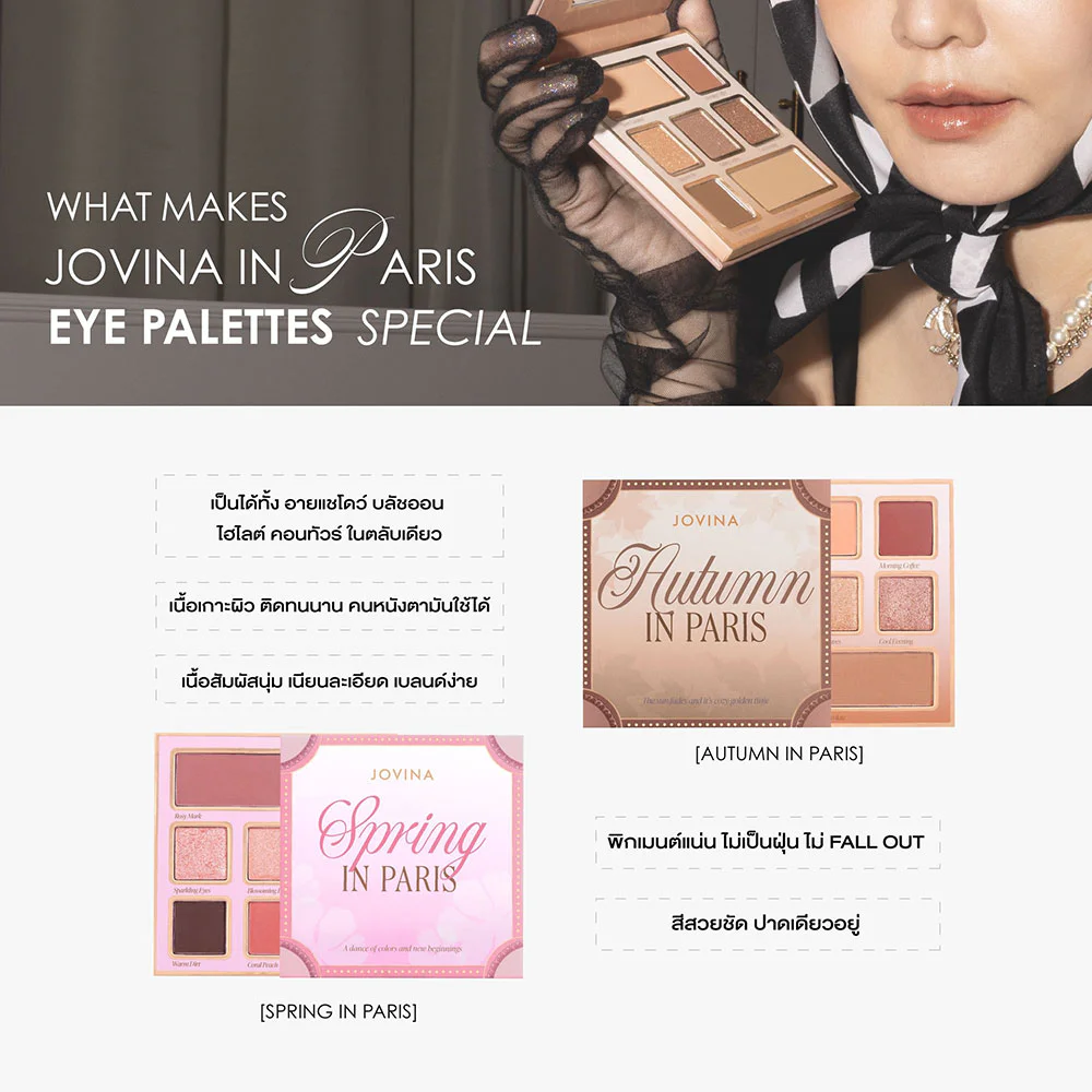 JOVINA Autumm In Paris Eye Palette 14.5g This 7-shade eyeshadow palette features matte, shimmer, and glitter textures. Its smooth texture, vivid pigments, blendability, and long-lasting wear are all available. The palette features the two seasons of romantic Paris, adding a pop of color to your eyes and creating a unique, chic look.