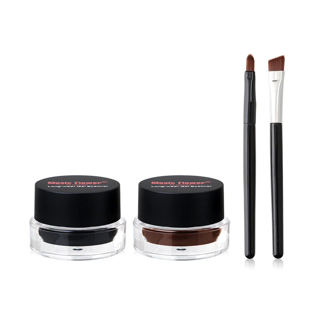 Music Flower Long Wear Gel Eyeliner 6g #Brown And Black Gel liner, waterproof, sweatproof, soft texture, easy to write, dense color, long-lasting all day, comes with 2 brushes for drawing sharp, beautiful liner lines, confident all day long.