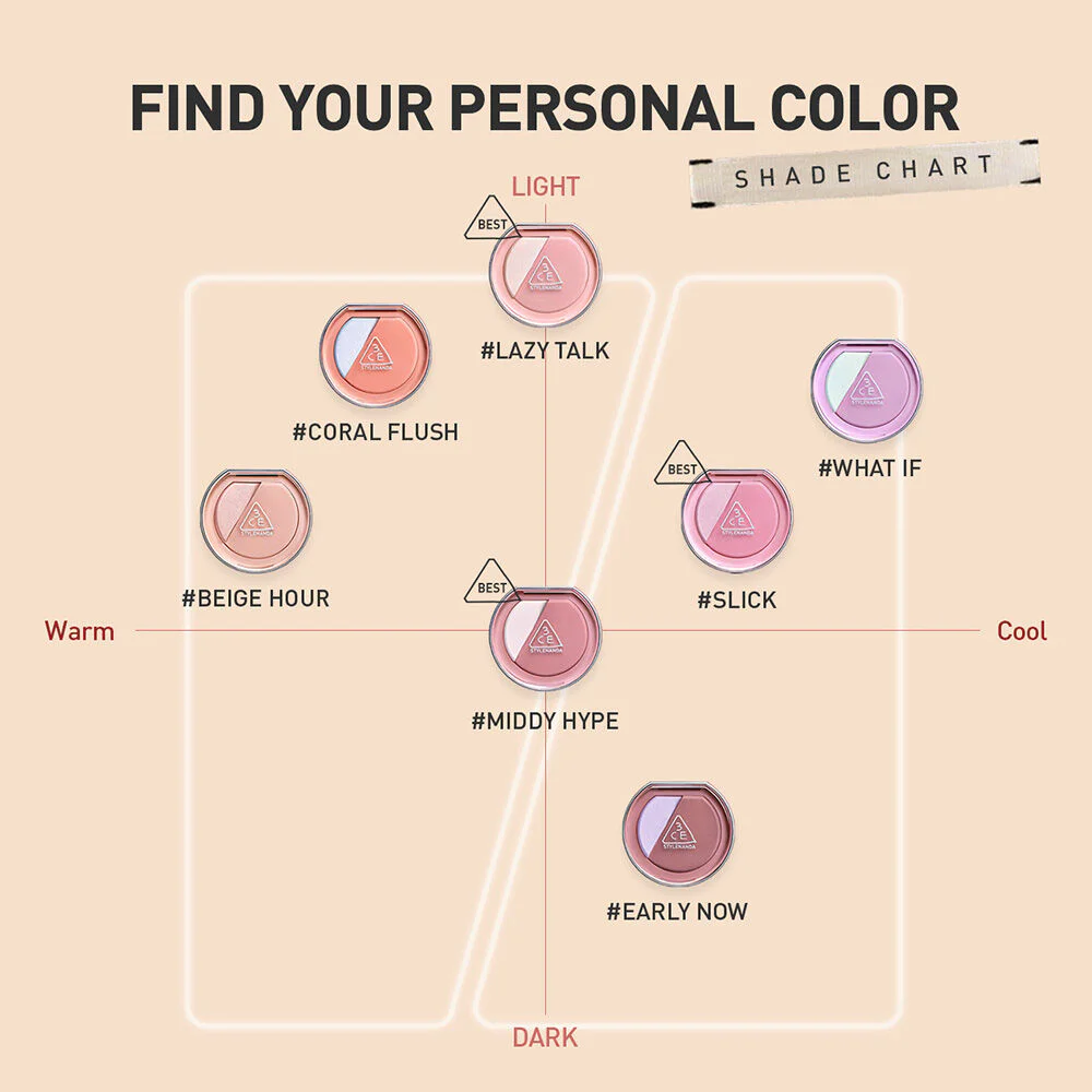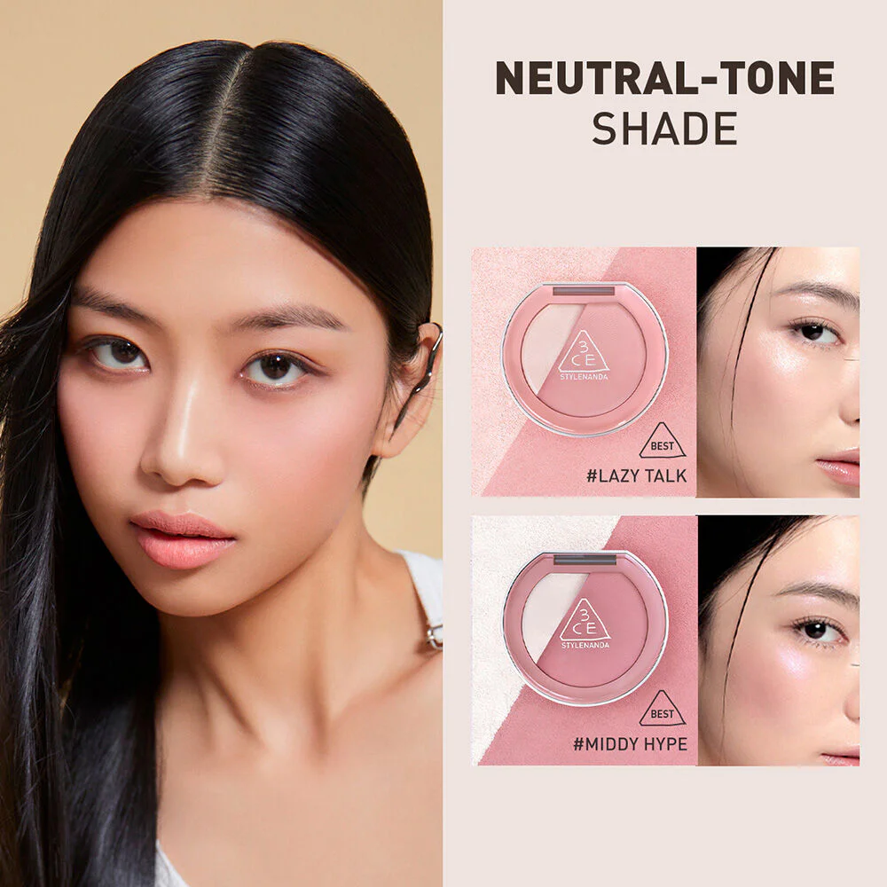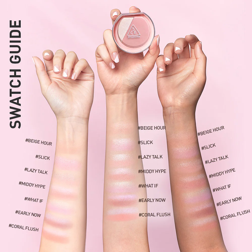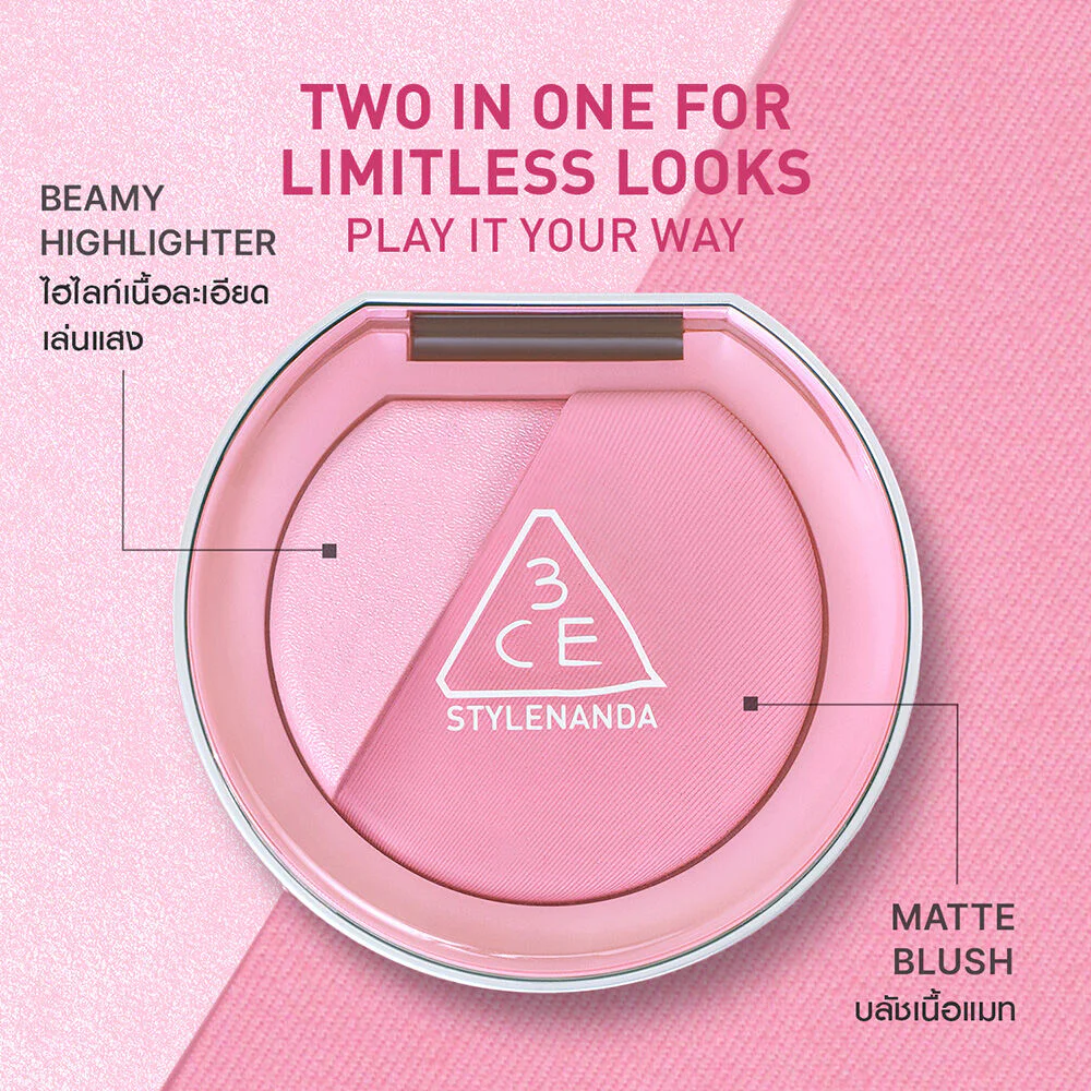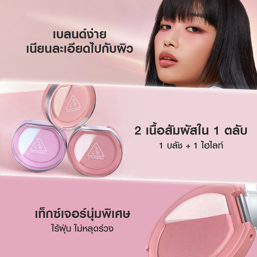 3CE Blush Lighter 4.3g #What If Blush with 2 textures in 1 case, including matte blush and shimmer highlighter, pearl shine, clear pigments, smooth and delicate touch, easy to spread, smooth on the skin, helps to increase brightness and prominence, looks dimensional to the face, can create various looks, shine every day.