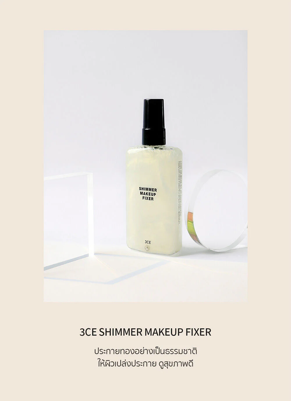 3CE Shimmer Makeup Fixer 95ml Shimmering skin spray helps makeup last longer and blurs the skin to make it look smooth, revealing beautiful, radiant, healthy, and glowing skin. Can be used on both the face and body.