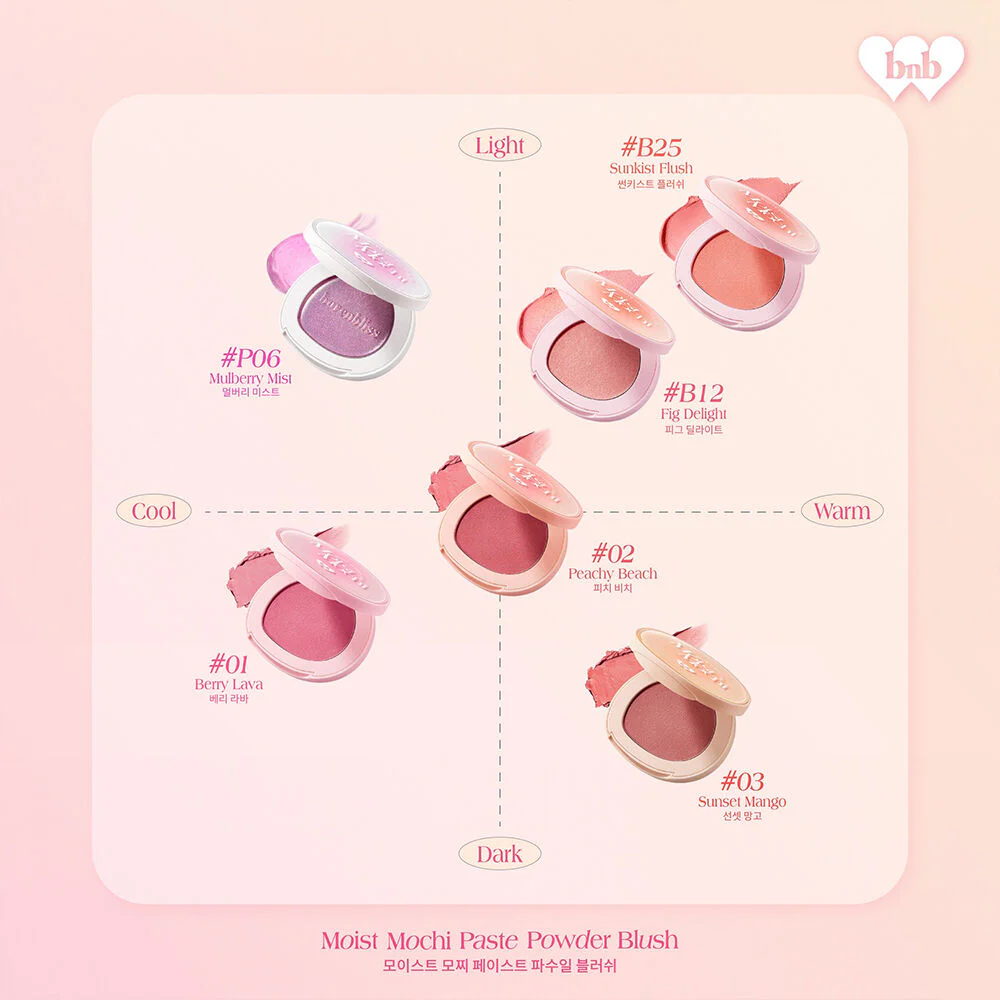 barenbliss Moist Mochi Paste Powder Blush 4.5g #B25 Sunkist Flush Mochi blush, soft and smooth texture, light touch, easy to spread, smooth on the skin, no stains, moisturizes, vivid color, long-lasting, gives cheeks a natural glow.