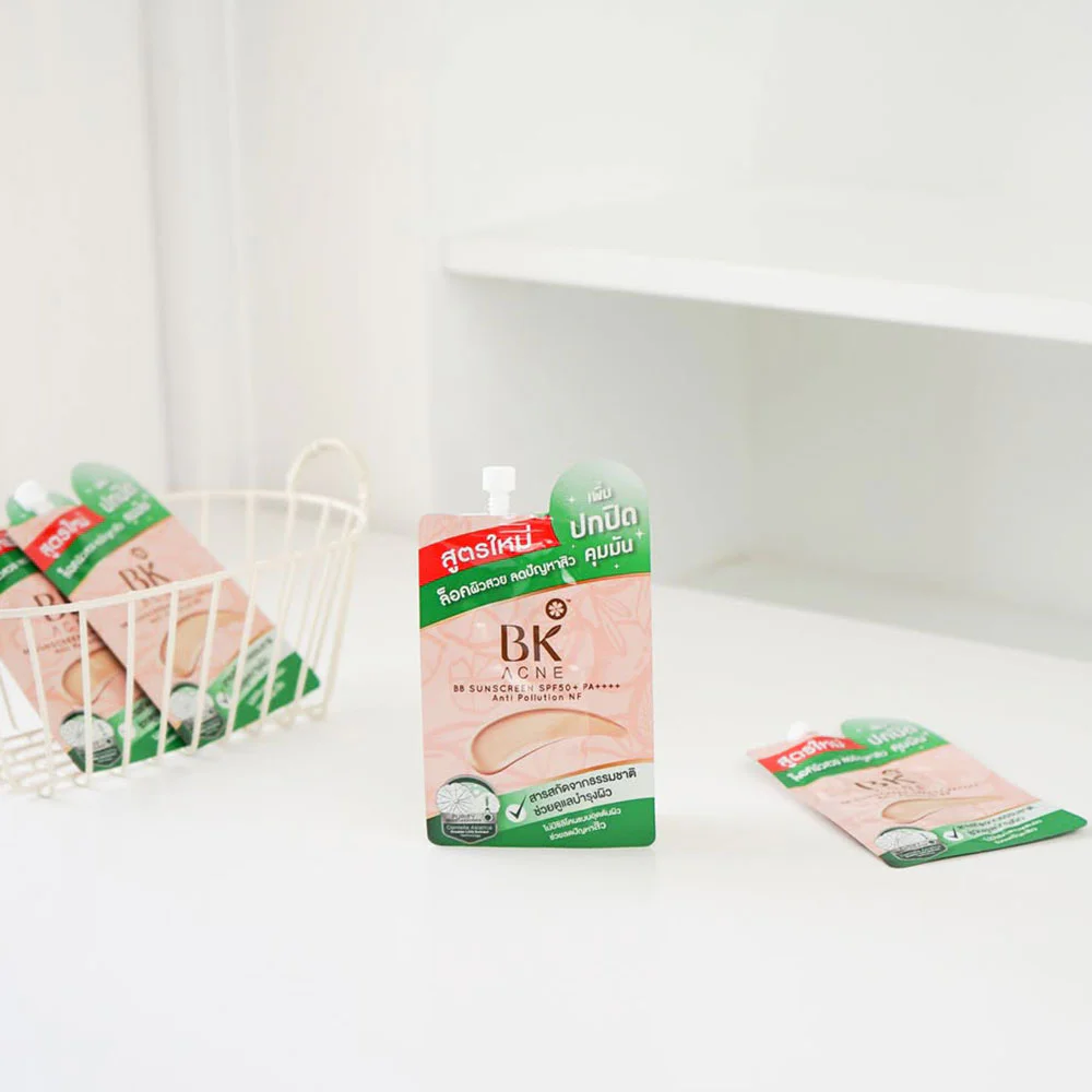 BK Acne BB Sunscreen SPF50+ PA++++ 4g Foundation for acne-prone skin. The foundation is smooth, soft, and light, but provides smooth coverage. It gives a natural look, healthy, radiant skin, and nourishes and protects the skin from pollution, dust, and sunlight, and helps absorb oil without clogging pores.