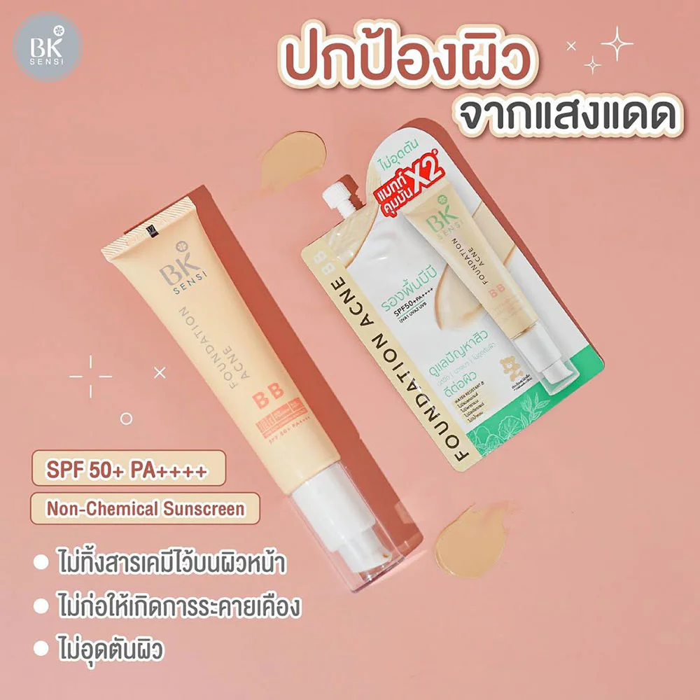 BK Sensi Foundation Acne BB 4g BB sunscreen foundation, conceals smooth skin, covers every blemish, gives natural beautiful skin like a professional. With innovation from Japan, it helps take care of acne problems, does not clog the skin, is good for sensitive skin, is a Non-chemical Sunscreen free from chemical sunscreens, helps protect skin from UV rays, Blue Light rays and IR rays with SPF50 PA+++, enriched with substances to protect skin from dust and pollution, helps "protect, nourish, conceal". Easy to use, light texture, easy to spread, does not leave residue, light on the skin, not sticky, absorbs quickly, dries quickly, matte and long-lasting oil control, it is a Multi Functional Sunscreen 3in1 benefit in one.