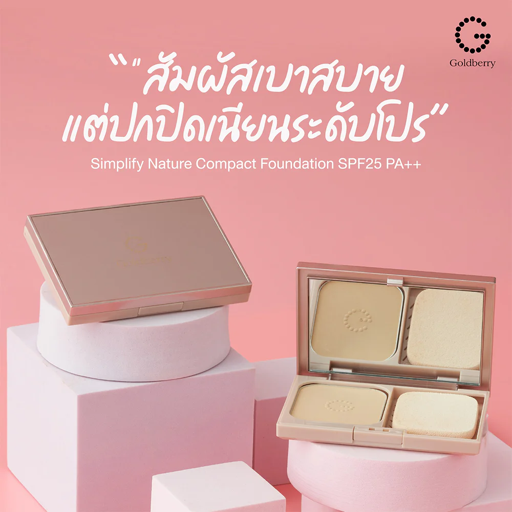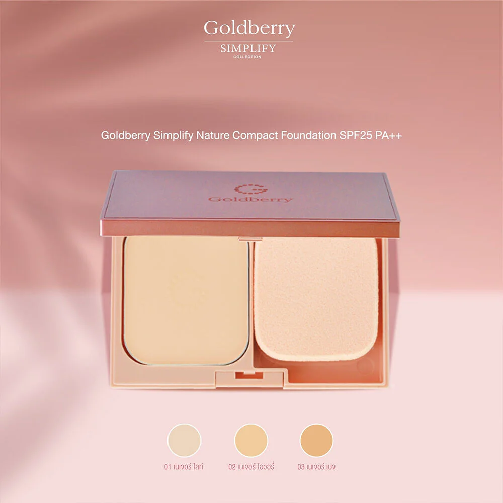 Goldberry Simplify Nature Compact Foundation SPF25/PA++ 9g #03 Beige This Japanese beauty formula powder foundation has a fine, lightweight texture that feels comfortable on the skin. It provides smooth, even coverage, flawlessly concealing all imperfections. Infused with the power of 3 Natural ingredients, it offers ultimate skin care, ideal for skin requiring extra attention.