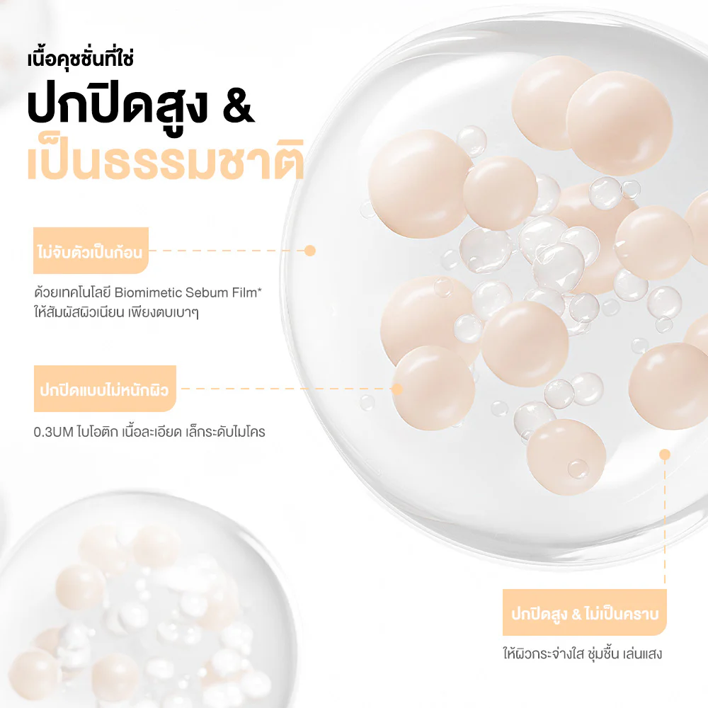 • Essence in the cushion Helps maintain balance between water and oil. Comes with extracts from purple reishi mushroom, snow lotus, and ginseng. Does not cause acne, nourishes the skin, and soothes.