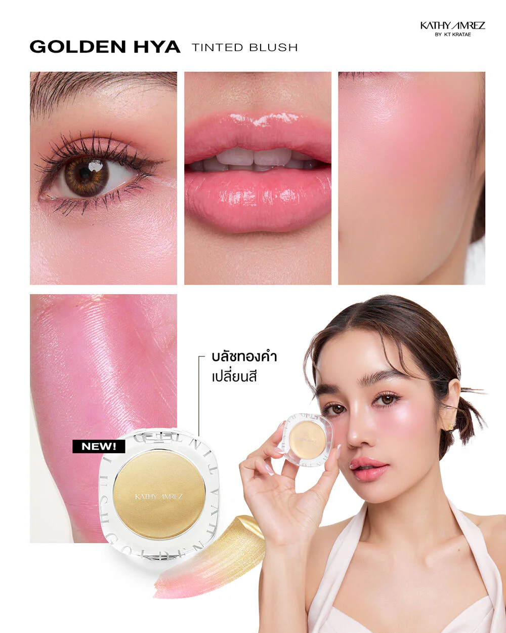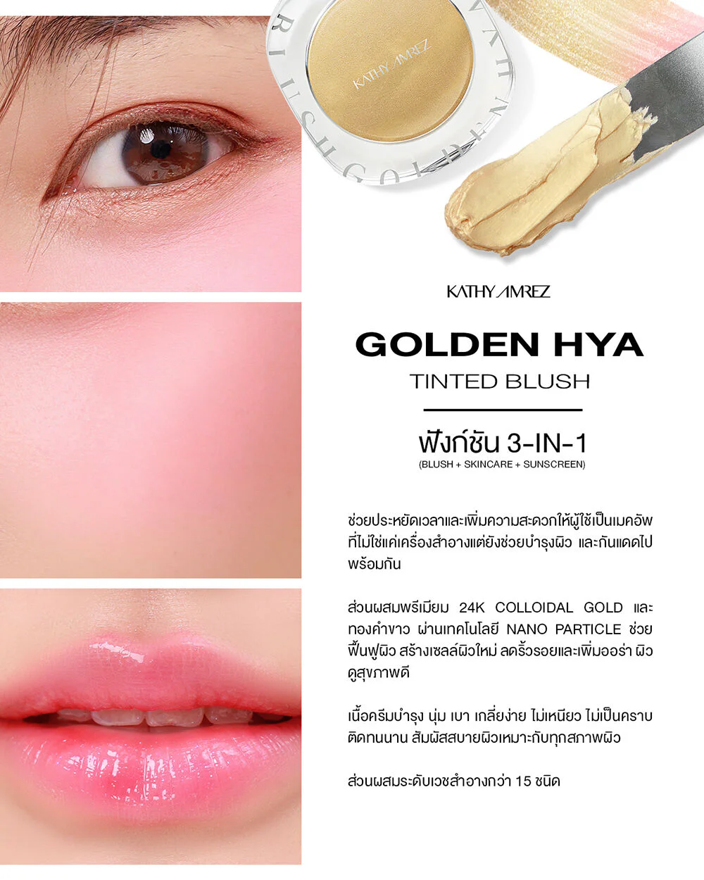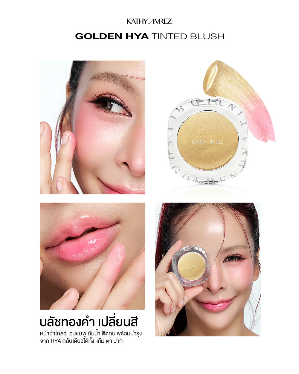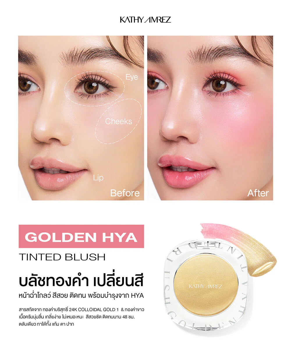 KATHY AMREZ Golden Hya Tinted Blush 4g Glowing, healthy-looking skin with gold blush that changes color according to the pH of the skin. Enriched with pure gold extract 24K Colloidal Gold 1 and white gold. The cream is soft and smooth, easy to spread, not sticky. Beautiful, clear color, long-lasting. One compact can be used on eyes, cheeks and lips.