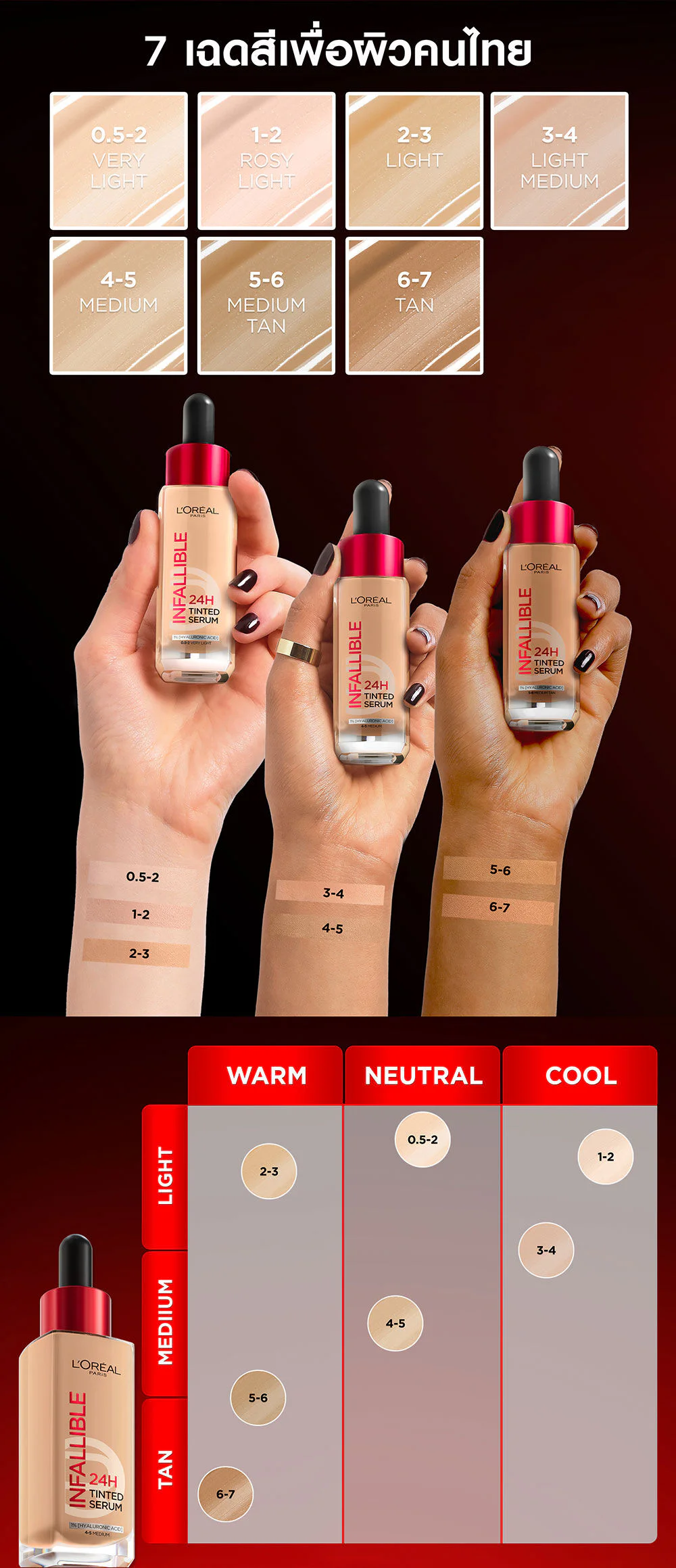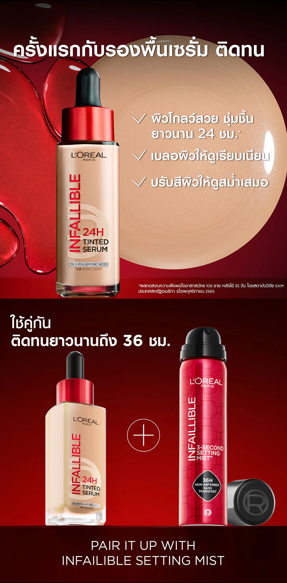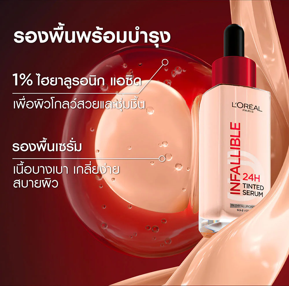 L'Oréal Paris Infallible 24H Tinted Serum 30ml #0.5-2 Very Light Serum foundation, combined with hyaluronic acid for moisturized skin, long-lasting beautiful glow, light texture, helps blur skin to look smooth, like your skin is better than before.