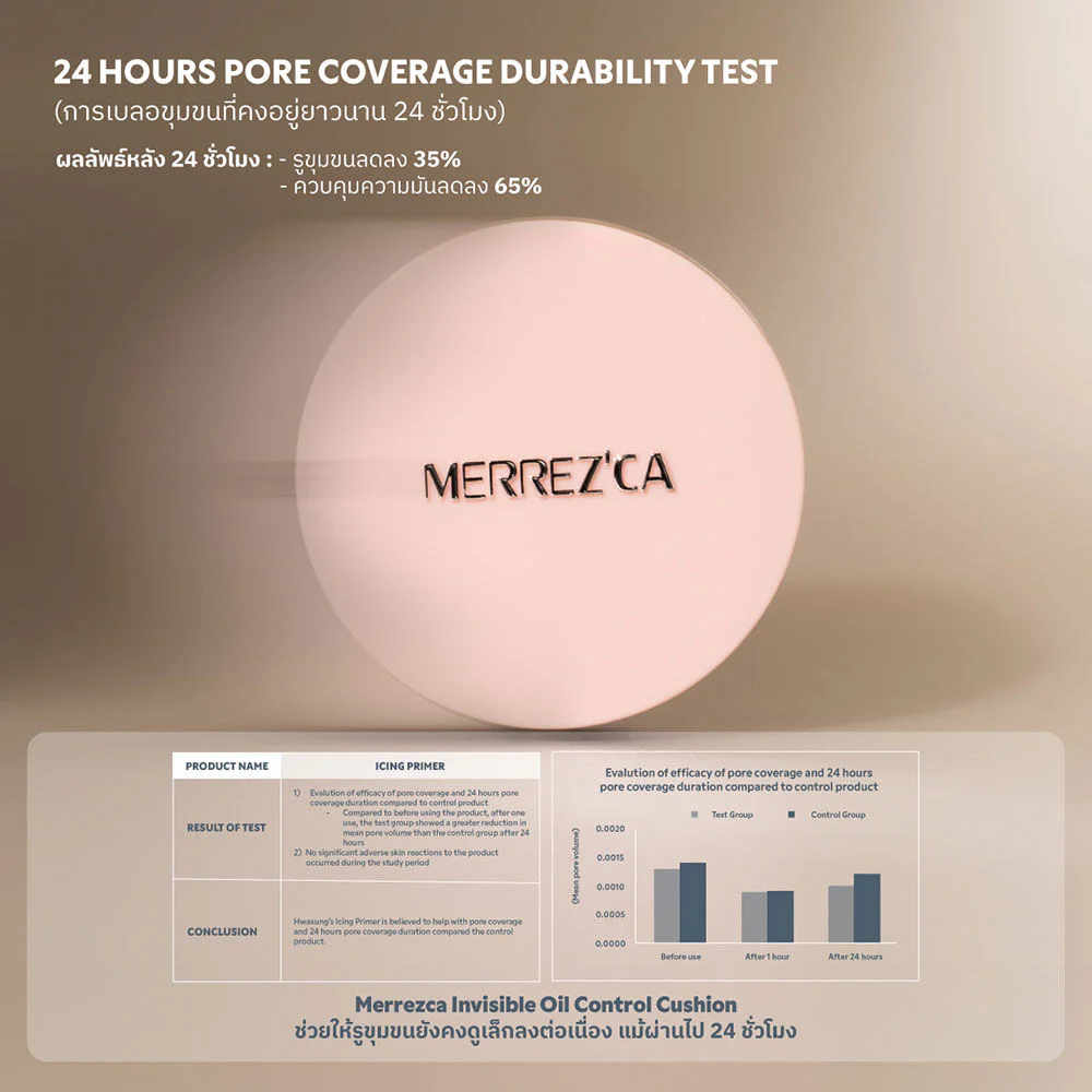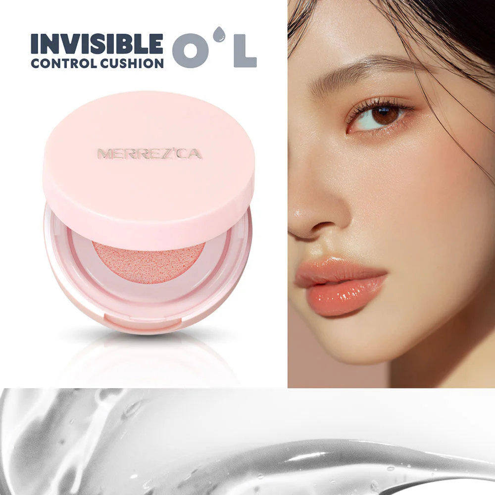 Merrezca Invisible Oil Control Cushion 2g Colorless gel cushion oil absorbing foundation, a new experience of a cushion primer that combines the power of Cooling + Blurring + Moisturizing in one step. Designed to answer all skin problems of people with oily skin, obvious pores, and makeup that doesn't last long. Provides a silky-matte finish that isn't dry, tight, or clogged.