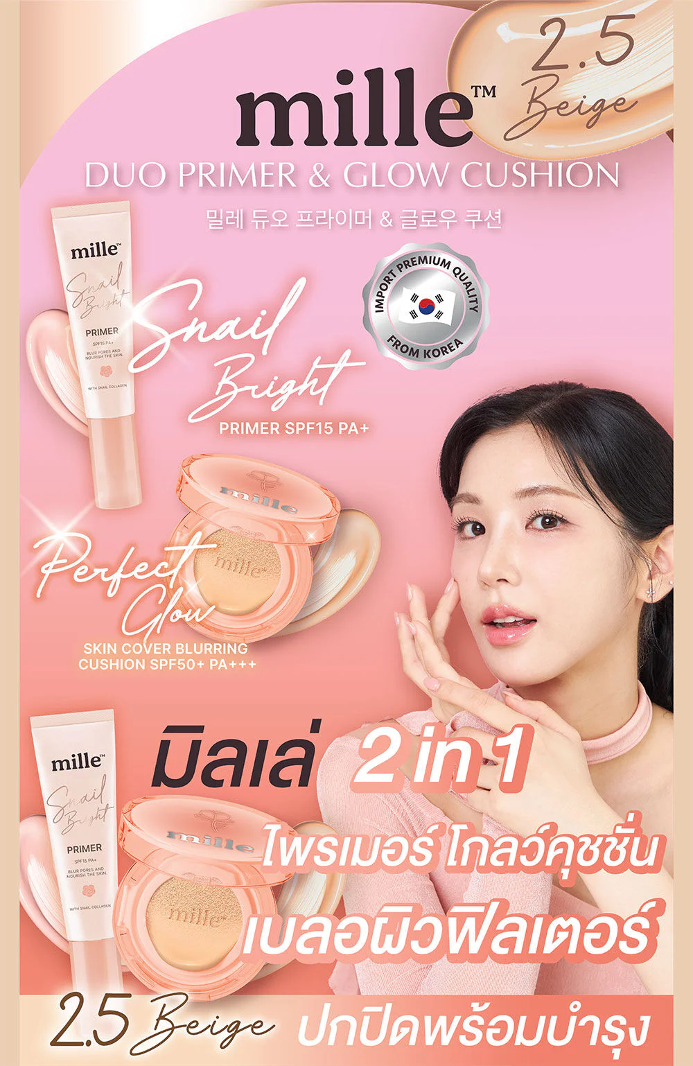 Mille 2in1 Bright Primer & Perfect Glow Cushion 8g #2.5 Beige A single sachet that combines primer and cushion, helping you apply makeup quickly and achieve smooth, beautiful skin in one step. Enriched with skin nourishing ingredients such as snail slime, hyaluronic acid, collagen, and ceramide, it helps strengthen and brighten skin.