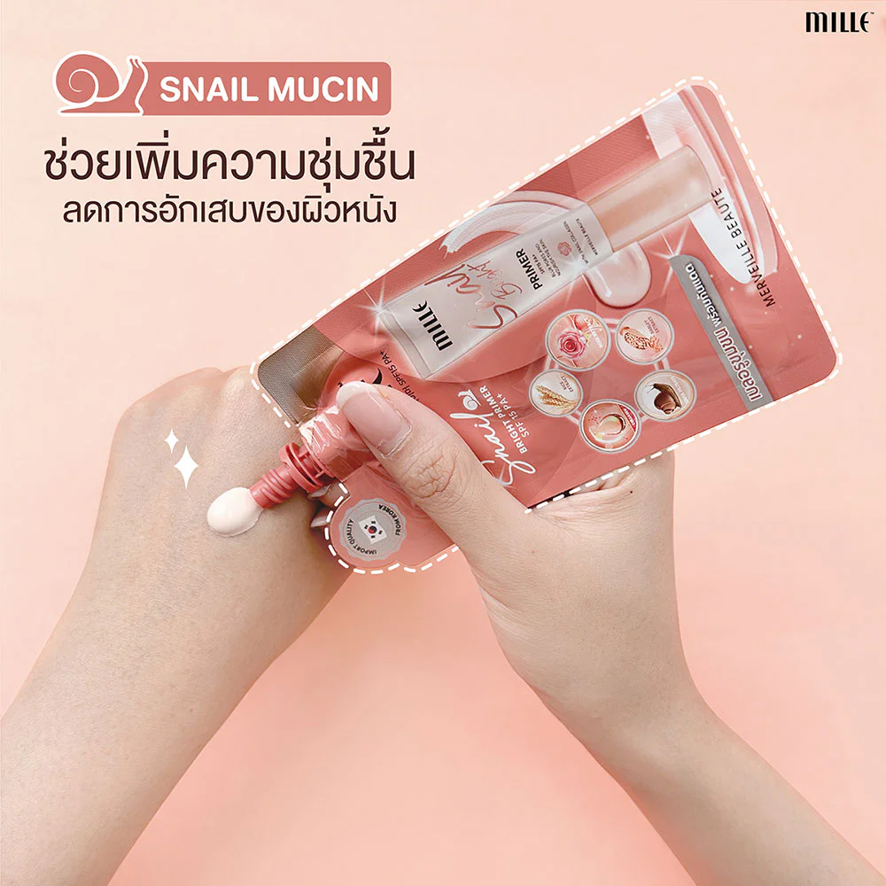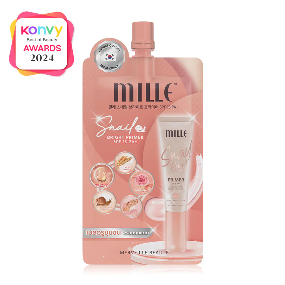 Mille Snail Bright Primer SPF15 PA+ 6g A primer product for use before or mixed with Mille Super Whitening Rose BB Cream to conceal skin for a smoother complexion and provide moisture for a beautiful, healthy-looking complexion at all times, preventing dullness throughout the day. Snail slime extract increases skin elasticity and firmness.