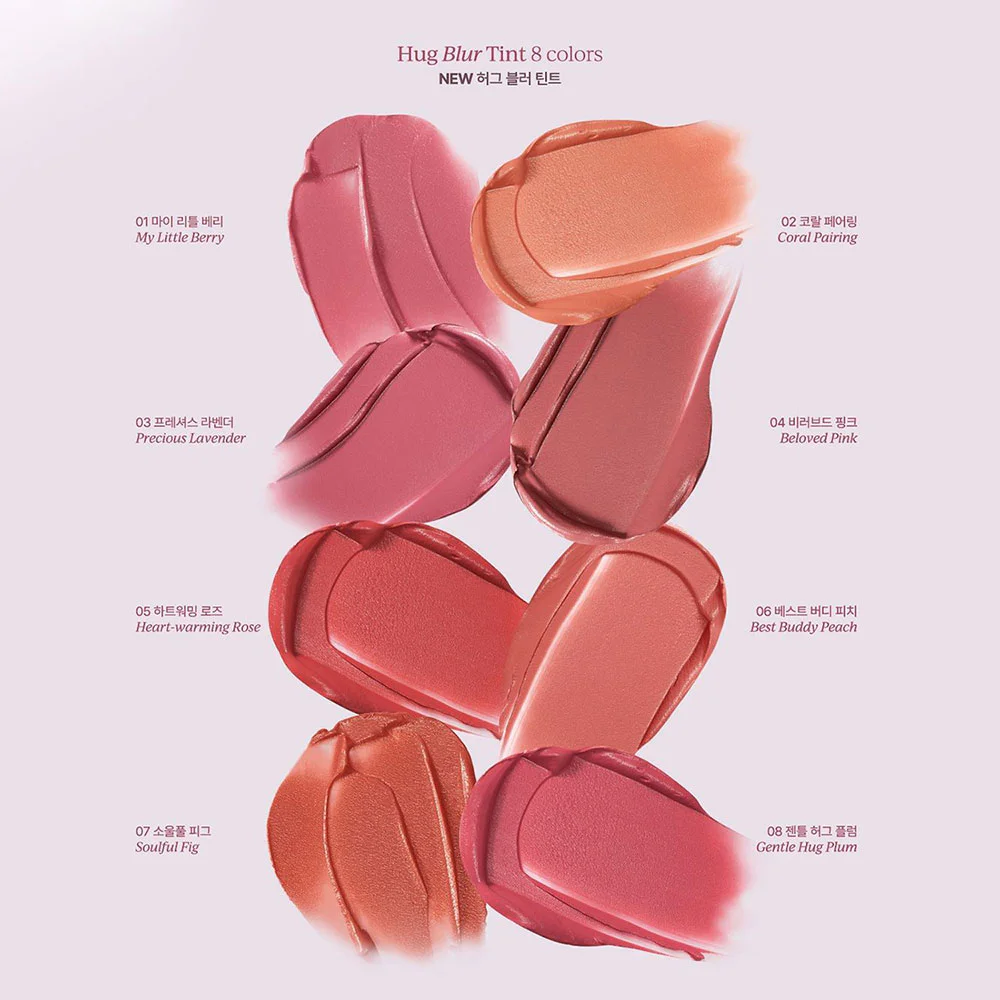 CLIO Hug Blur Tint 3.1g #08 Gentle Hug PlumA soft and smooth lip tint that adds color to your lips, making them look bright and beautifully blurred with a special blurred formula tint from CLIO. The tint is as soft and smooth as a teddy bear's fur, giving a beautiful matte finish and filling in the lines of your lips to make them full. With a blurred lip edge effect, it helps adjust the shape of your lips to be beautifully soft. It contains nourishing ingredients that help make your lips soft and smooth, preventing them from drying out and not settling into the lines.