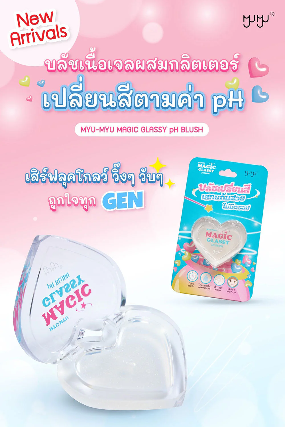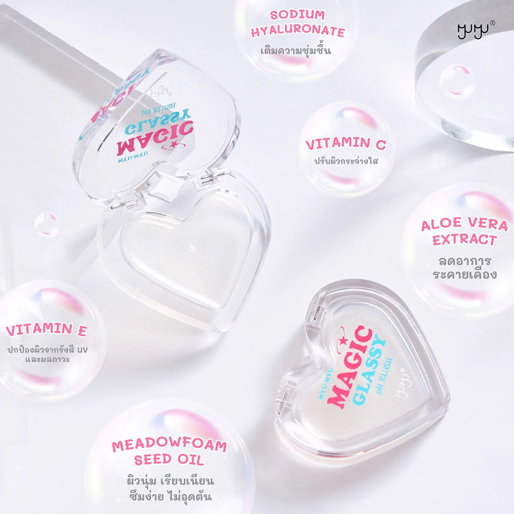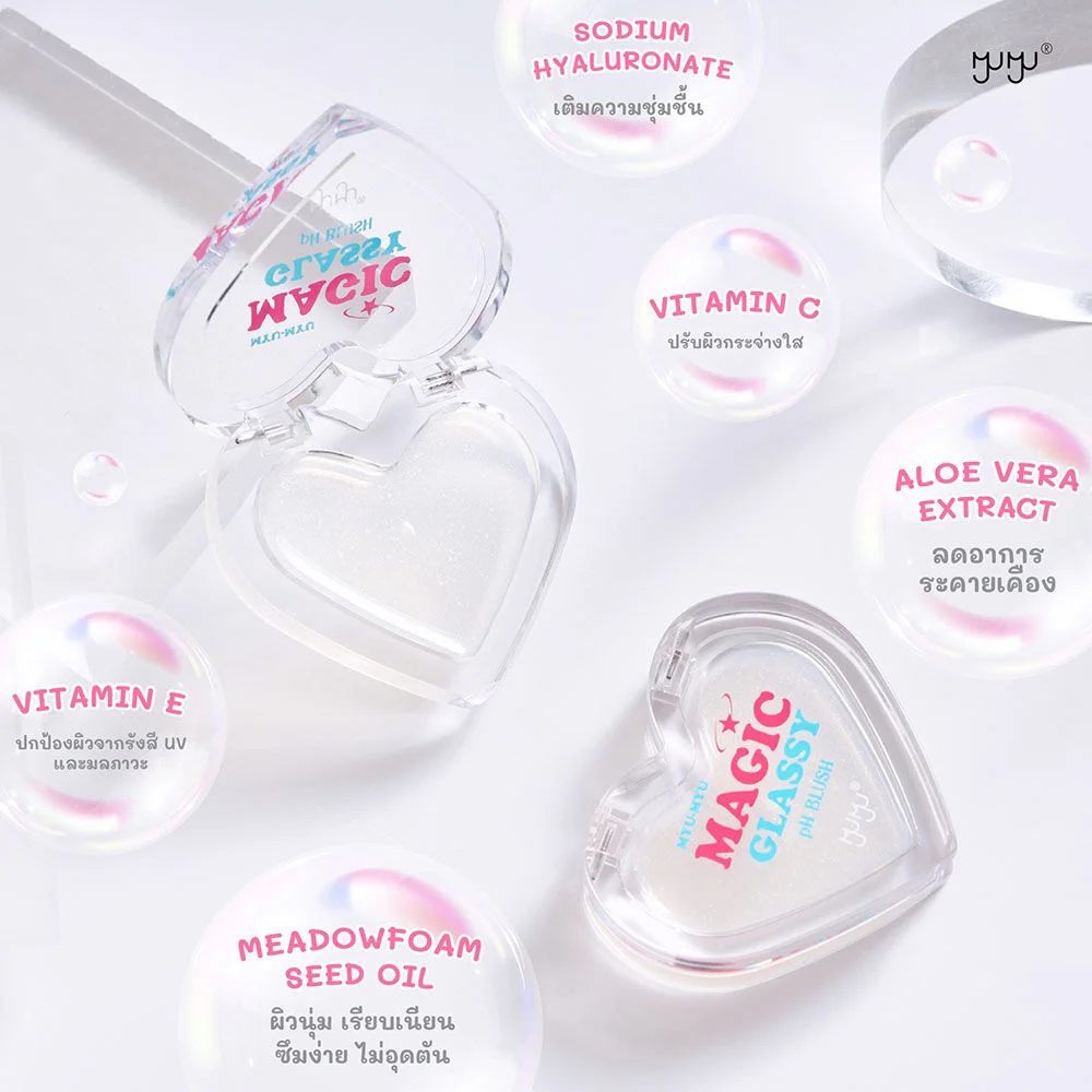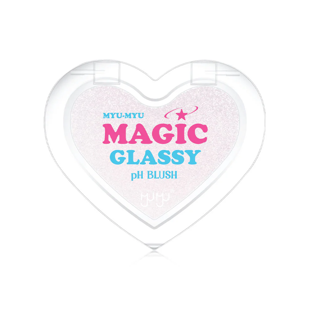 MYU-MYU Magic Glassy PH Blush 3g A sheer gel blush with shimmering glitter that changes color according to skin's pH. It has a lightweight feel, is easy to blend, provides intense color, and is long-lasting. Formulated with Meadowfoam Seed Oil, Vitamin C, Aloe Vera Extract, Sodium Hyaluronate, and Vitamin E, it nourishes and moisturizes the skin, leaving it soft, smooth, and radiant with a healthy glow.