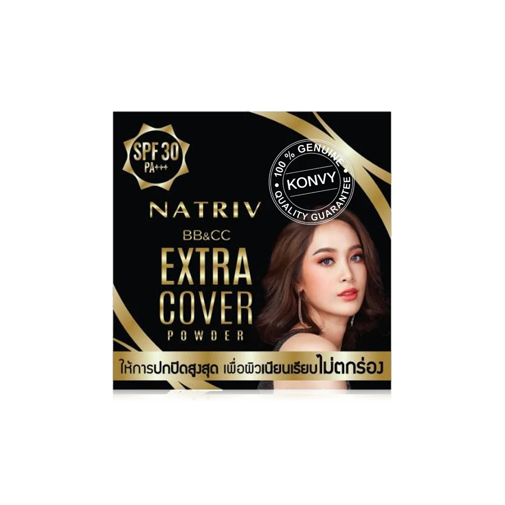 NATRIV BB & CC Extra Cover Powder 6g #1 Foundation powder with Extra Cover formula that provides perfect coverage and conceals imperfections, lasts longer, and provides a coating of powder particles and pigments with Silicone Treated Powder and Pigment, helping the powder color blend with the skin tone of the face better than general powder. The face does not look dull during the day, along with a combination of oil absorbents, helping the face to be smooth and not shiny, along with added value from Sakura Extract, which works together with Tocopheryl Acetate, helping to nourish the face to be bright, attractive, and always moist, while protecting the skin from UV rays with SPF30 protection.