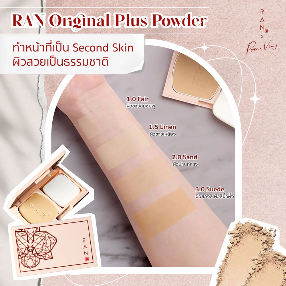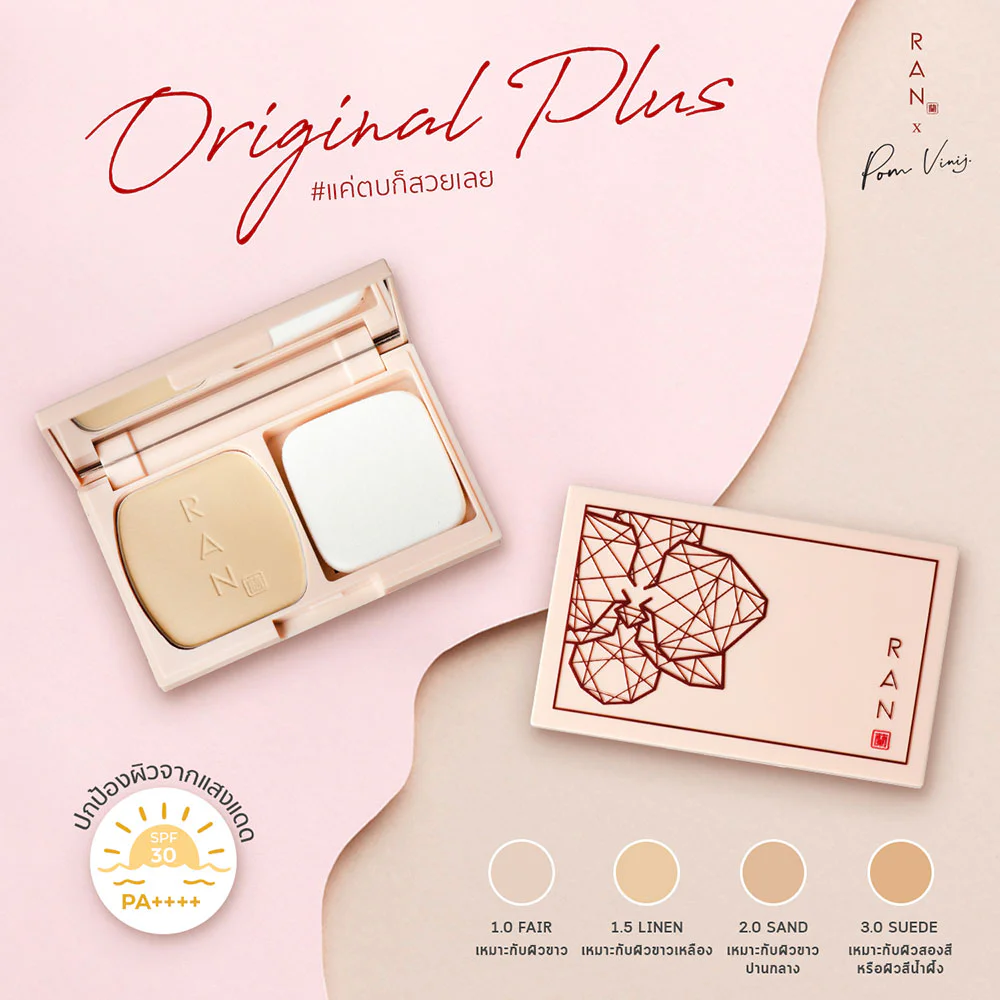 RAN COSMETIC Original Plus+ Powder 14g #3.0 Suede RAN Original Plus Powder has been developed to provide more coverage, protection, nourishment and oil control than the original formula, but still looks natural with light-diffusing technology. The powder is light on the skin and easy to use. Even people who are not skilled in makeup can use it. It can be used as Everyday Looks or increase the level of coverage for use on important days. In addition, it also contains nourishing substances that are suitable for today's lifestyle to increase the efficiency of skin care. It is a Skincare Powder that is suitable for this fast-paced era. Many people may not be able to complete their skincare application in the morning. RAN Original Plus Powder can meet the needs because it contains both nourishing substances and sunscreen. It is a Skincare Powder along with the properties of an effective Makeup Powder.