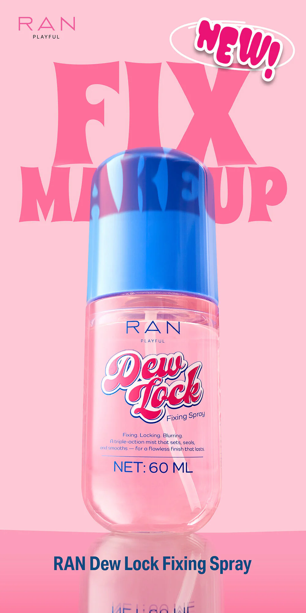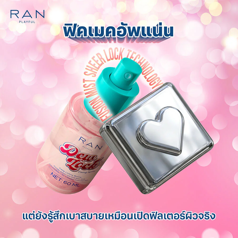 RAN Playful Dewlock Fixing Spray 60ml This makeup setting spray features innovative Fusion Mist Sheer Lock Technology and Micro-Fusion Polymers to lock makeup in place for long-lasting wear without feeling heavy on the skin. It also contains SheerLock Complex to smooth the skin, blur pores, and maintain skin elasticity. Enriched with a special mandarin orange peel extract from Ehime Prefecture, Japan, it refines the skin texture and provides a dewy, natural-looking finish.