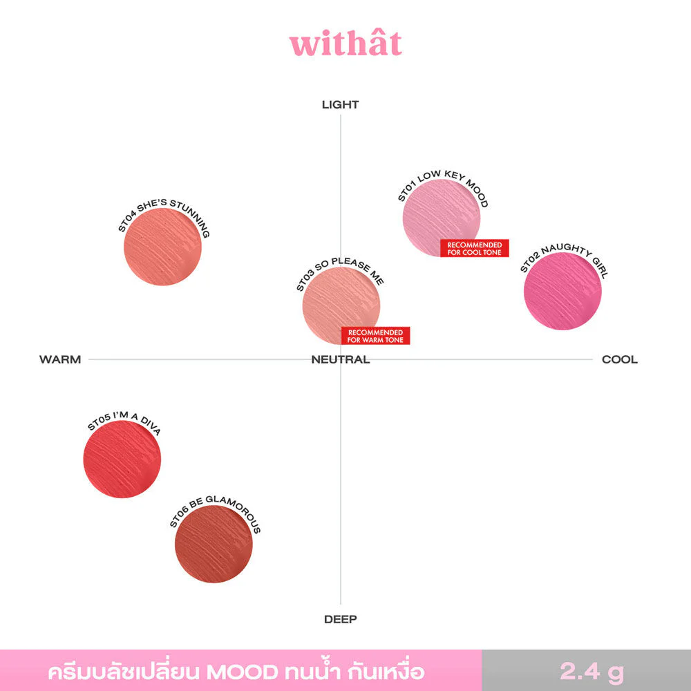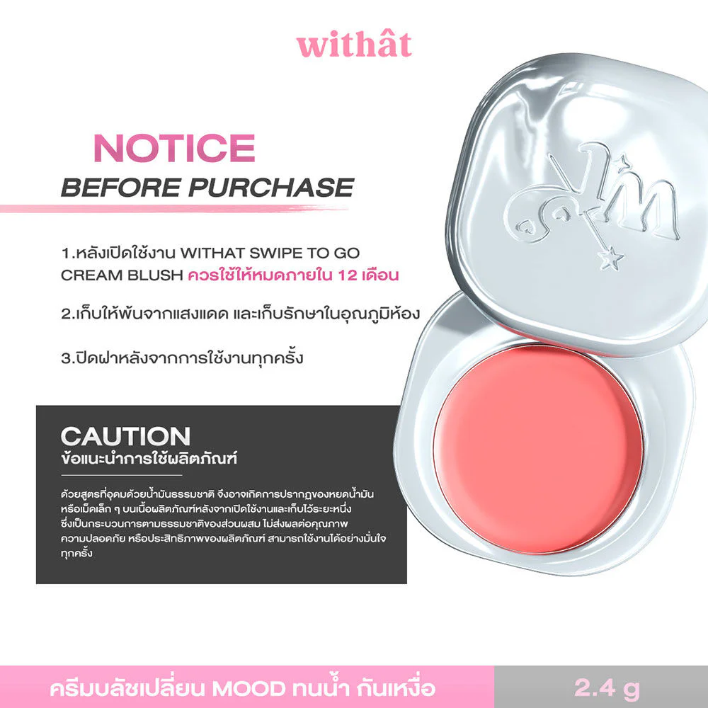 withat Swipe To Go Cream Blush 2.4g #ST05 I'm a diva This waterproof, sweat-proof cream blush offers a soft, beautiful color tone that adds a touch of color to your cheeks, making makeup more fun because Witthat believes that every shade is a feeling that tells your story each day.