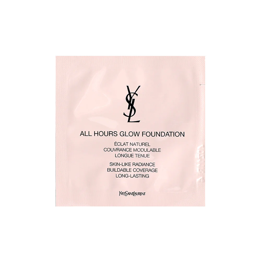 YSL All Hours Glow Foundation 0.8ml This lightweight, comfortable foundation provides excellent coverage and long-lasting wear. It blurs imperfections for a smooth, even complexion, and features innovative skin-nourishing ingredients like Hyaluronic Acid and Niacinamide to deeply hydrate and leave skin looking plump, radiant, and flawless—like couture skin.
