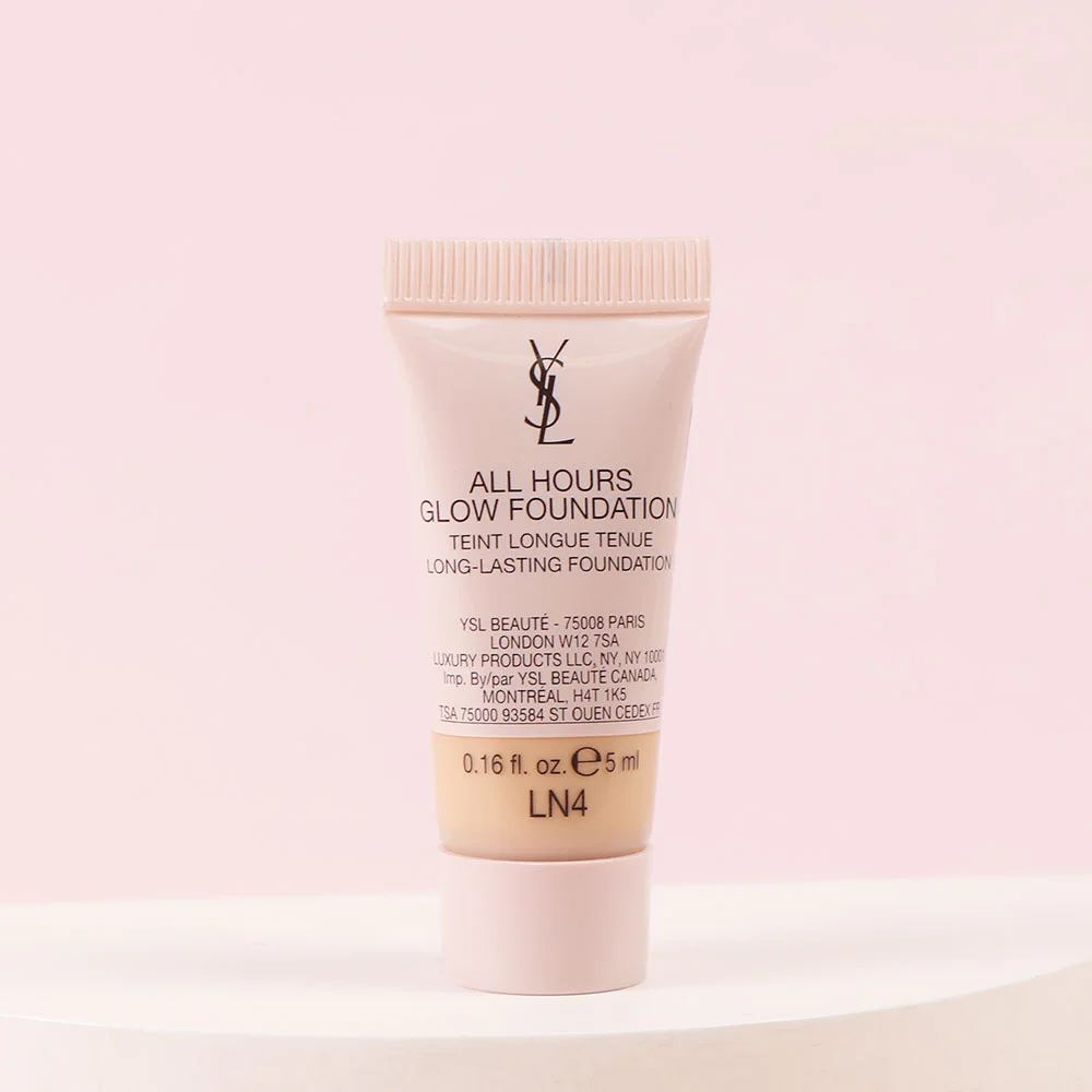 YSL All Hours Glow Foundation 5ml #LN4 This lightweight, comfortable foundation provides excellent coverage and long-lasting wear. It blurs imperfections for a smooth, even complexion, and features innovative skin-nourishing ingredients like Hyaluronic Acid and Niacinamide to deeply hydrate and leave skin looking plump, radiant, and flawless—like couture skin.