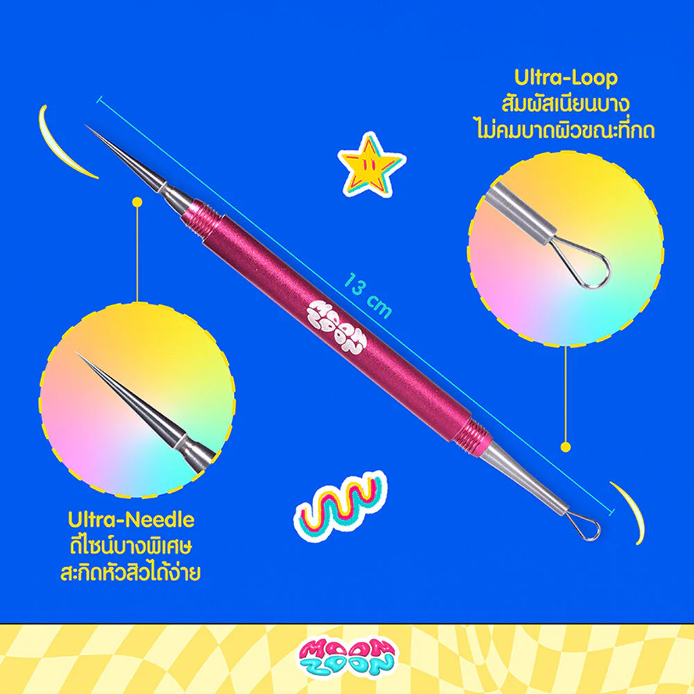Moonzoon Comedone Extractor 1pc 2in1 stainless steel pimple popper with a lid. The Ultra-Needle head is designed to be extra thin, allowing you to easily poke at the pimples. The Ultra-Loop round ring is designed to pop at the pimples, providing a smooth, thin touch that won't cut your skin while you're pressing.