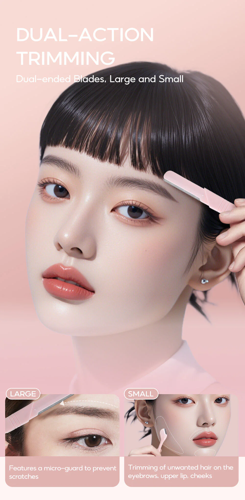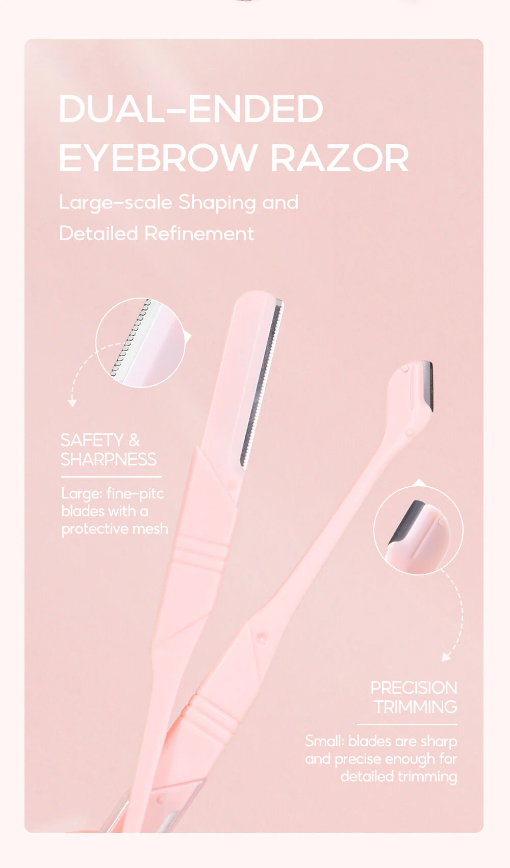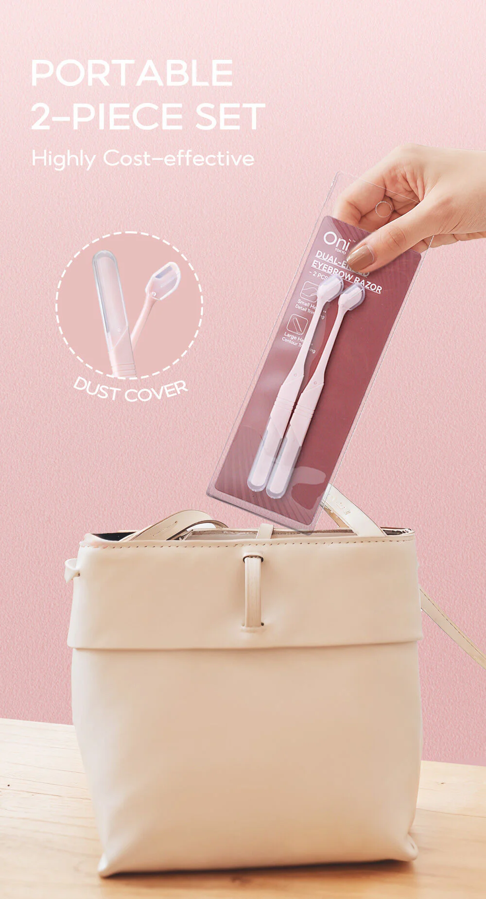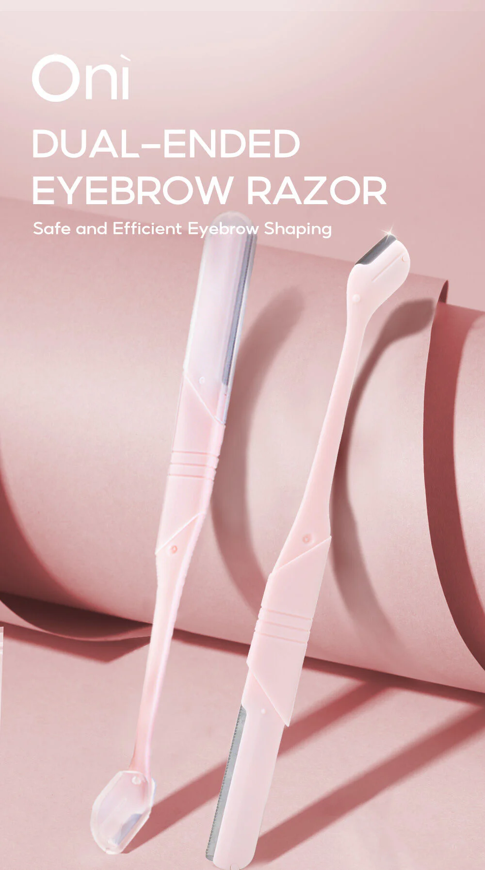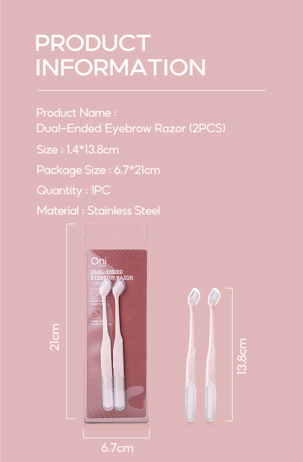 Oni Dual-Ended Eyebrow Razor 2pcs #Sakura Pink This double-ended eyebrow trimmer in Sakura pink comes with two blades in one handle: a small blade for detailed grooming and a large blade for precise brow styling. Easy to use, it trims your eyebrows smoothly and creates the perfect brows you desire.
