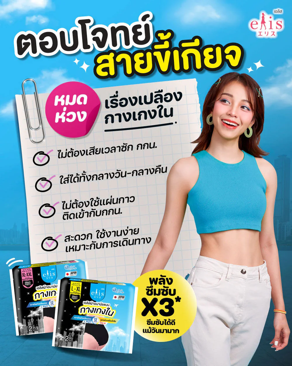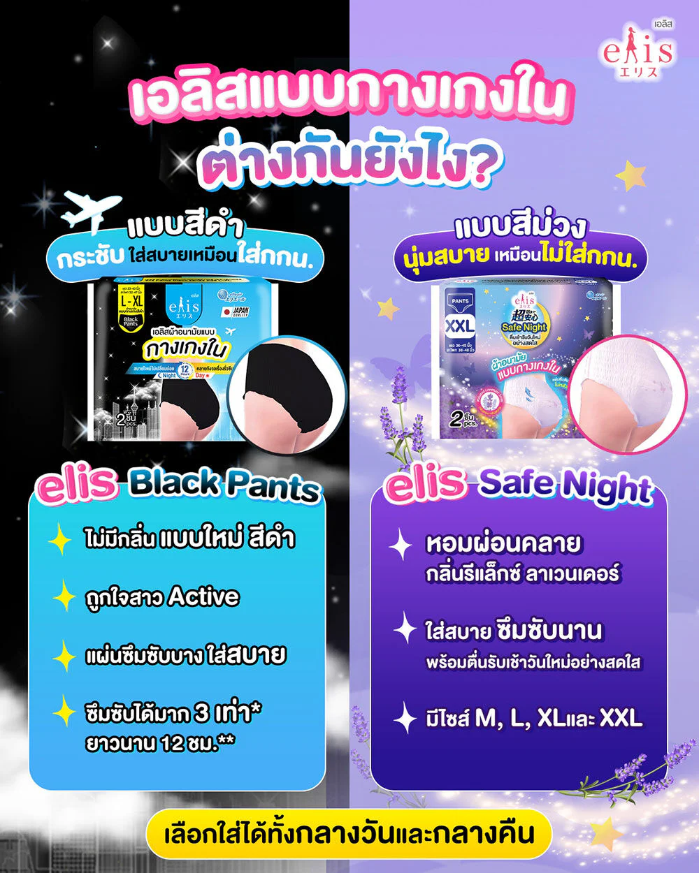 Elis Sanitary pants Black Pants L-XL 2pcs Black panty sanitary pads, size L-XL, thin and comfortable on the skin with a thin absorbent sheet of only 0.29 cm. with 3 times the absorption power. Able to absorb well even on heavy days. Firm, flexible, fits the body shape, fits every movement, smooth like wearing underwear.