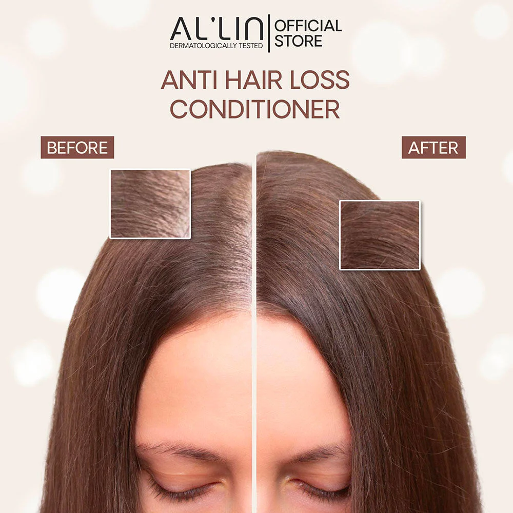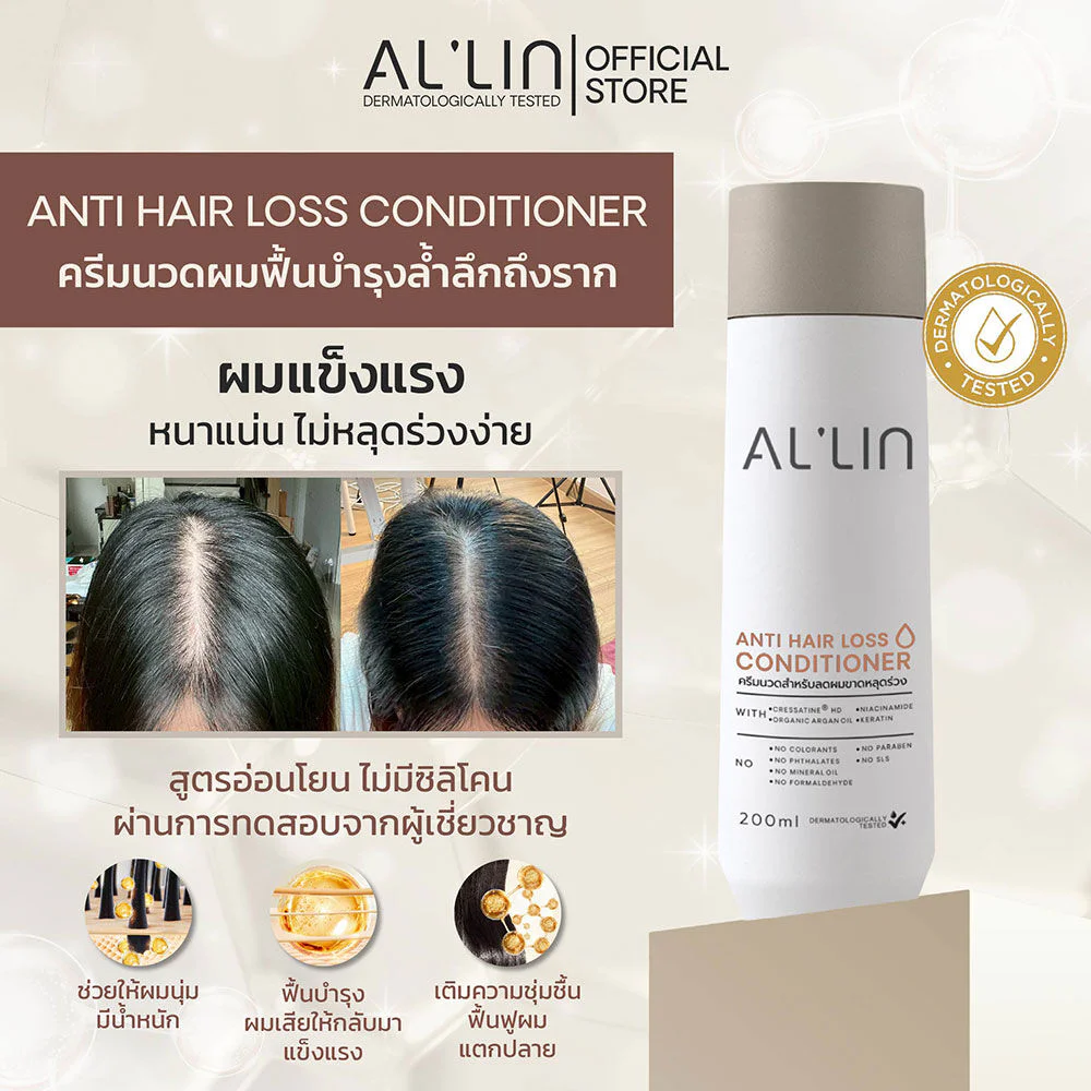 Al'lin Anti Hair Loss Conditioner 200ml This anti-hair loss conditioner combines the power of nature and dermatological innovation with Cressatine, Bioecolia, red ginseng, keratin, and argan oil to reduce hair loss, strengthen hair roots, and provide moisture for soft, smooth, and manageable hair.