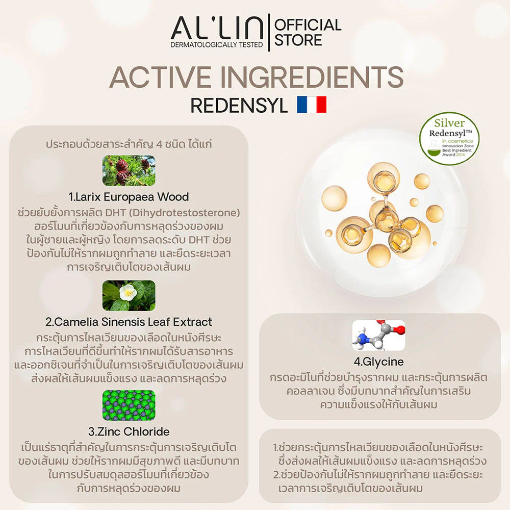 Al'lin Anti Hair Loss Serum 50ml This hair serum combines Procapil, Redensyl, Anagain, Capixyl, and red ginseng to nourish hair roots, reduce hair loss, and restore hair to appear thicker, stronger, and naturally healthier.
