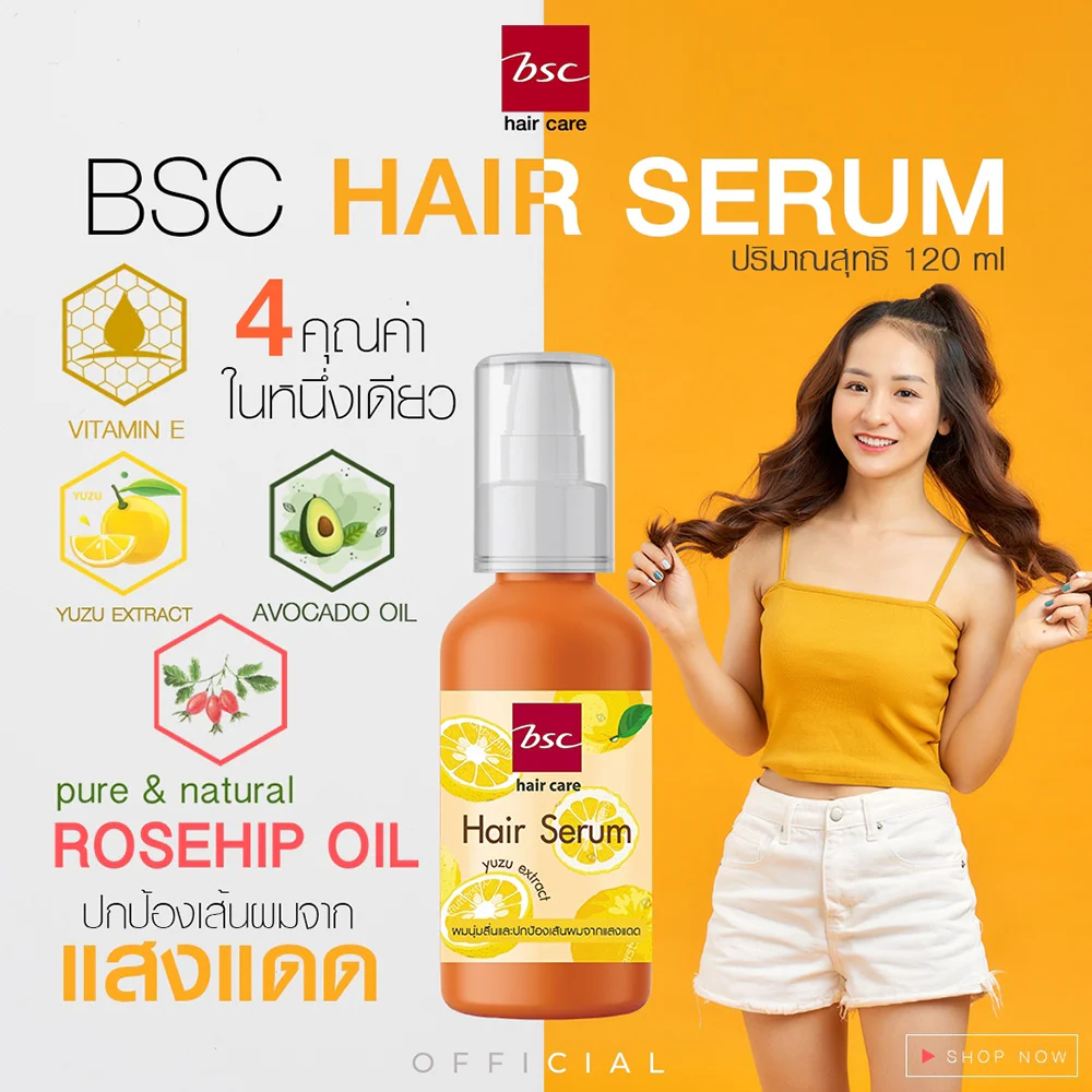 BSC Hair Care Hair Serum 120ml Hair serum helps nourish hair and coat dry, damaged hair cuticles to make them smooth. With the value of Vitamin E and Yuzu Extract, rich in antioxidants, it helps protect hair from sunlight. Combined with Rose Hip Oil and Avocado Oil, it conditions hair to be soft, smooth, and lively without leaving a sticky feeling. It adds shine to hair, making it naturally smooth and easy to style.