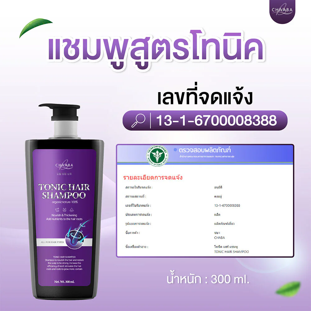 CHABA Tonic Hair Shampoo 300ml Shampoo, Tonic formula, nourishes hair to be black and shiny, restores hair condition, reduces frizziness, dryness, and split ends, strengthens hair roots and hair, and naturally improves hair and scalp health.