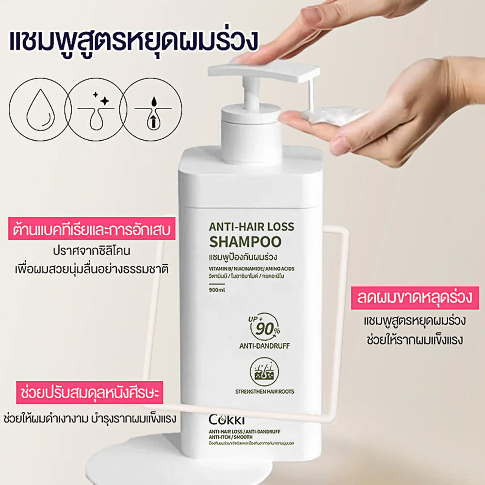 cokki Anti-Hair Loss Shampoo 900ml A shampoo that helps reduce oiliness and hair loss. It balances water and oil on the scalp, increases hair strength and elasticity, and helps hair look shiny and soft.