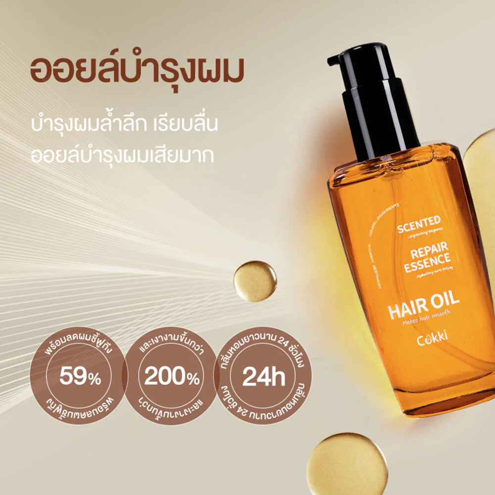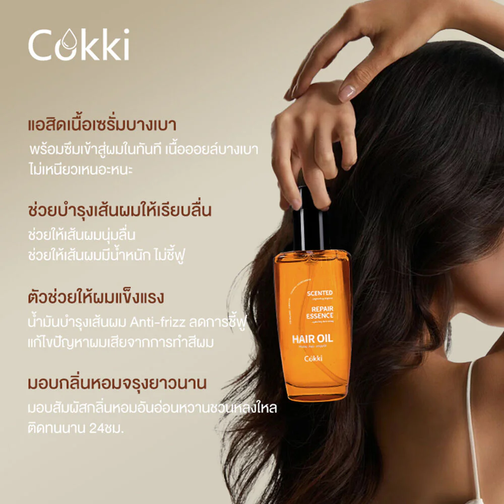 cokki Scented Repair Essence Hair Oil 100ml Hair oil helps replenish moisture to damaged hair. Enriched with plant and flower oil extracts, it nourishes hair, leaving it smooth, weighted, and frizz-free. It also provides a sweet, alluring fragrance that lasts for a long time.