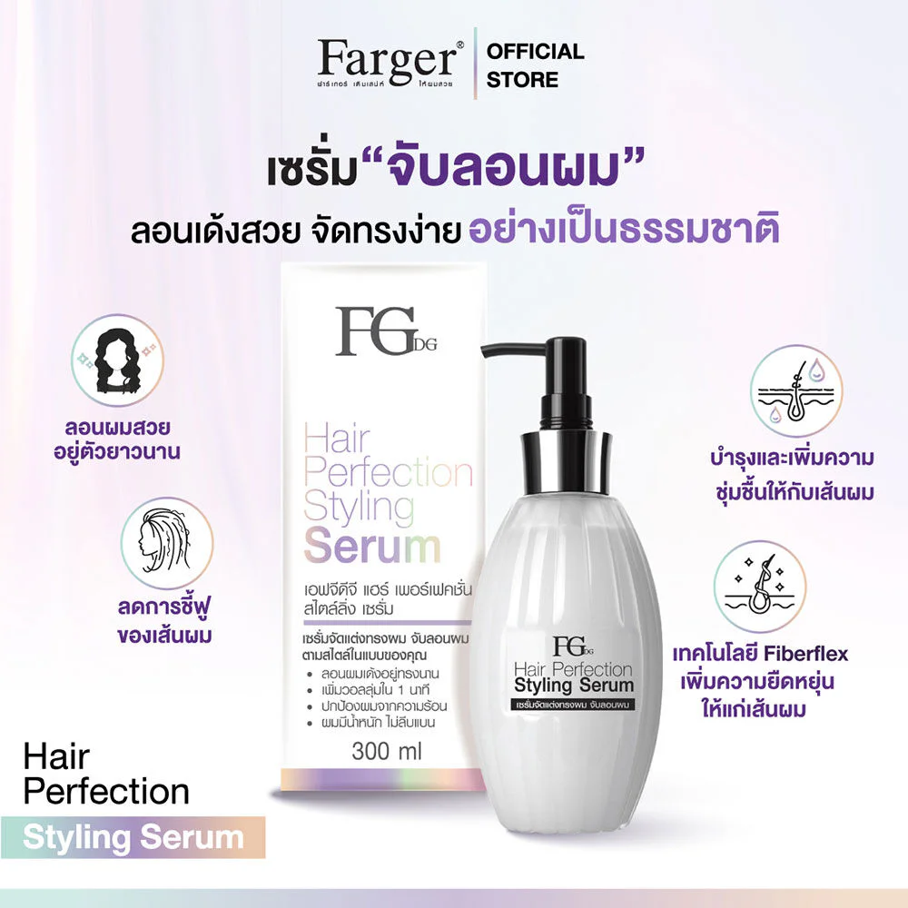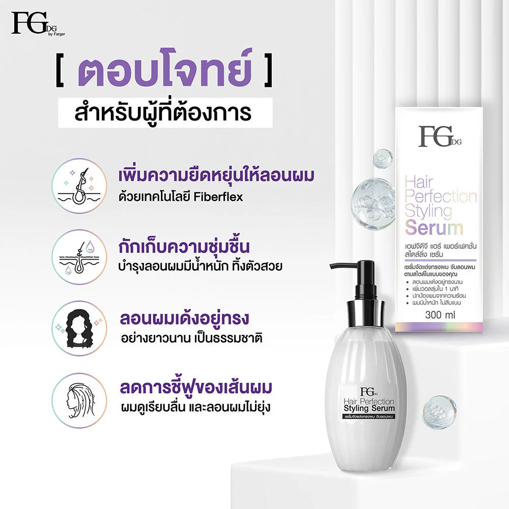 FGDG Hair Perfection Styling Serum 300ml Hair nourishing serum with a light texture, not sticky, feels like spider webs. With FiberFlex innovation, it helps to style hair or curl hair more easily and reduces static electricity. Combined with Macadamia seed oil extract, it helps to add moisture to dry and damaged hair and balances dry and damaged hair to return it to being soft, smooth, and lively.