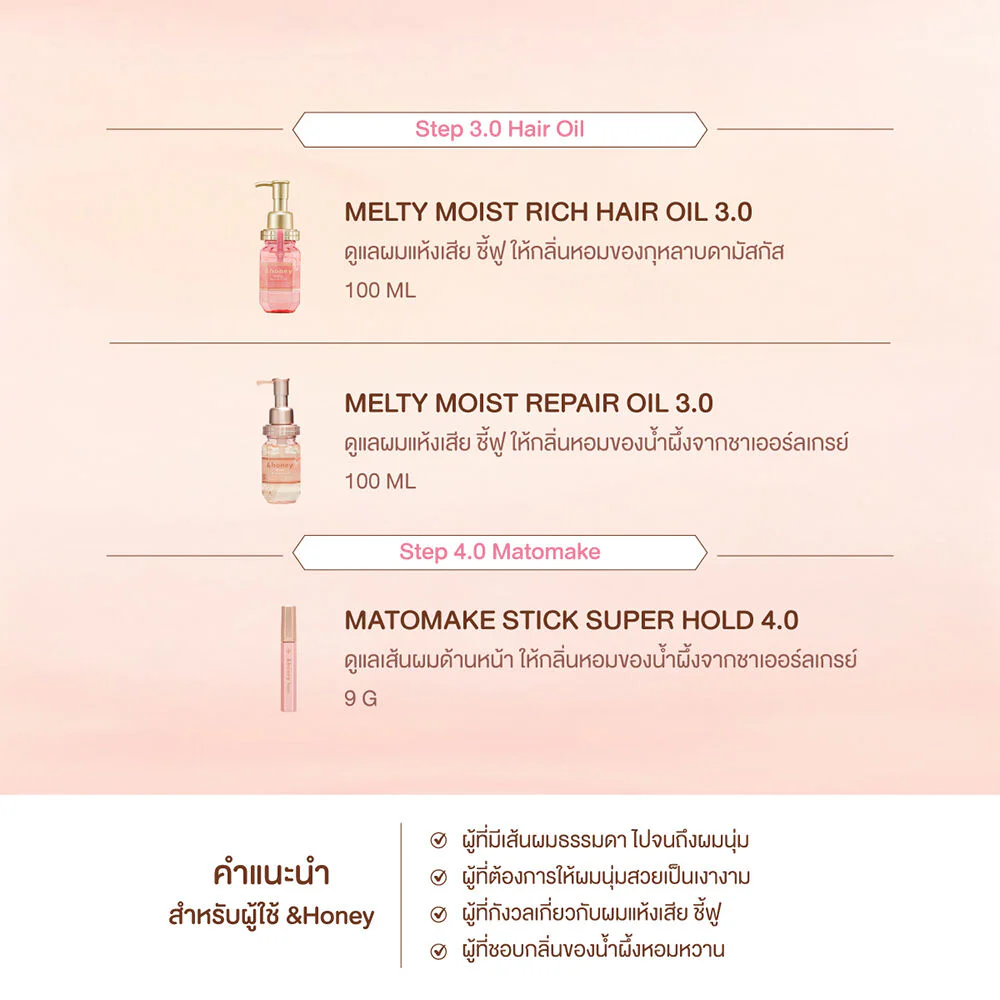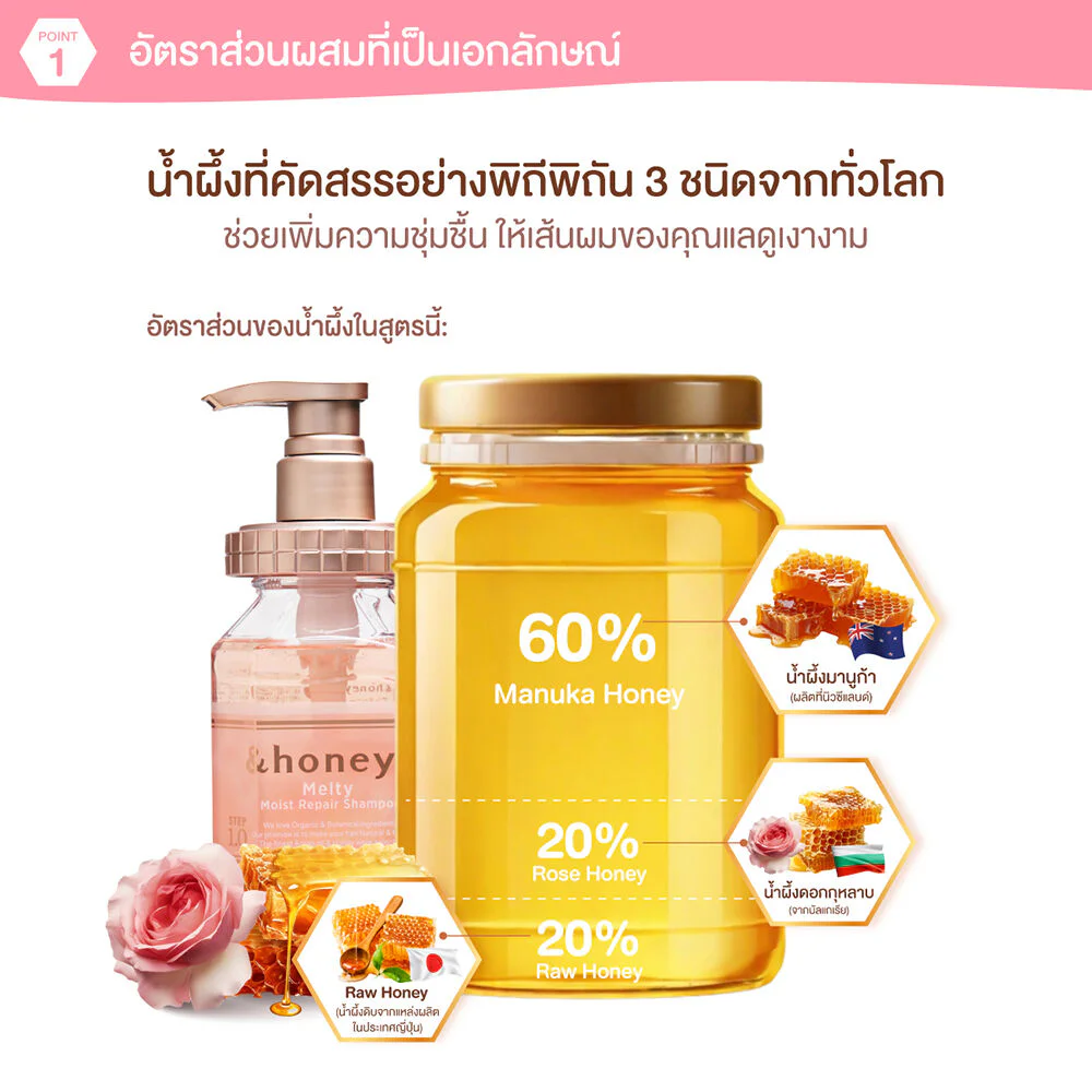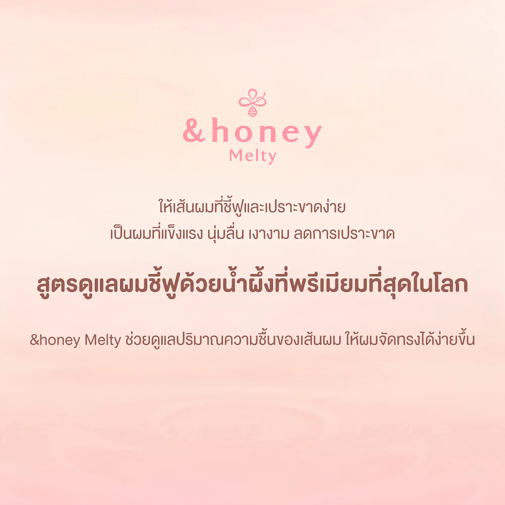 &honey Melty Moist Repair Hair Pack 130g Hair Pack cares for hair, helps maintain the moisture balance of hair to be healthy and specifically solves the problem of frizzy hair. It combines 3 types of honey in natural golden proportions, giving off the fragrance of honey from Oriental roses, the most premium honey in the world, to make hair that is frizzy and brittle become strong, soft, smooth and shiny again.