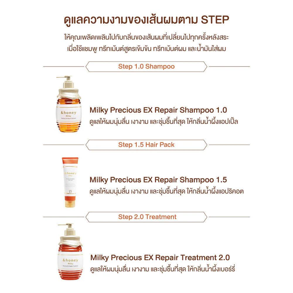 &honey Milky Precious Ex Repair Shampoo 500ml A shampoo for extra damaged hair using the newly developed Honey Beauty Care New Water Retention Damage Care Formula that focuses on effectively retaining moisture and repairing damaged hair. It has a sweet apple honey scent combined with daisy flowers.